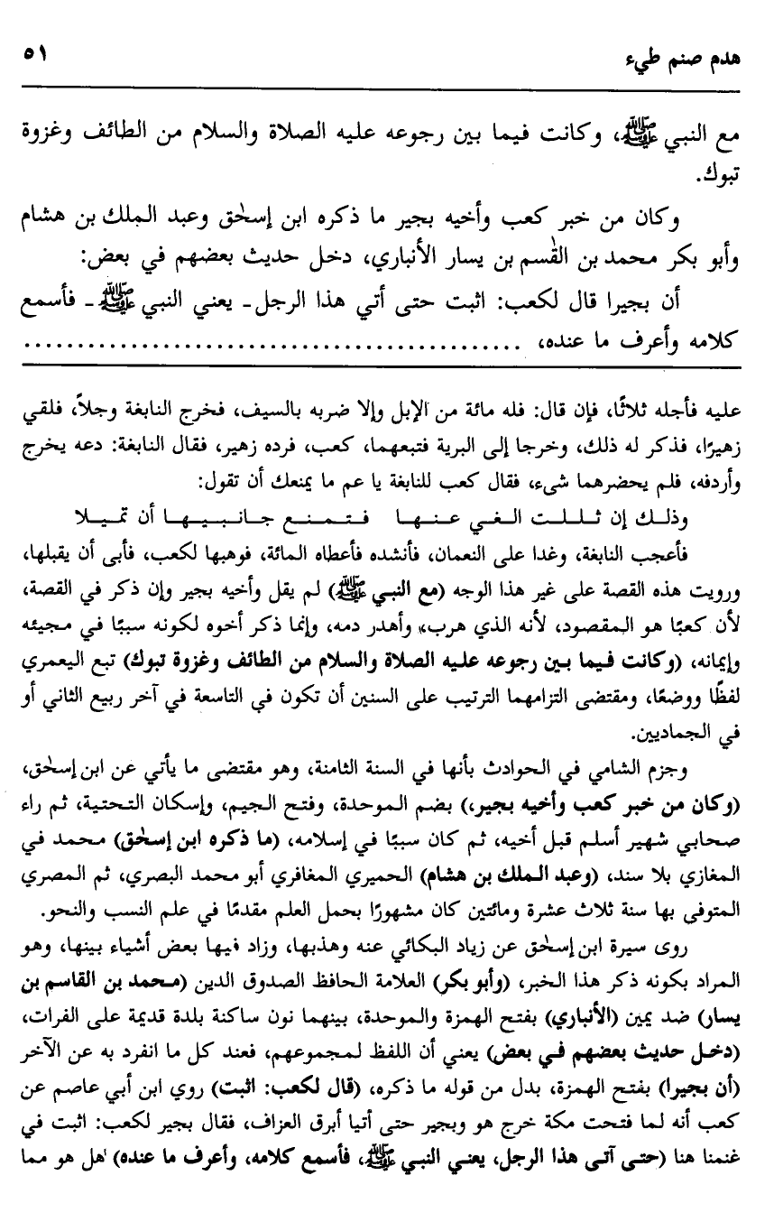 وجزم الشامي في الحوادث بأنها في السنة الثامنة، وهو مقتضى ما يأتي عن ابن إسحاق، "وكان من خبر كعب وأخيه بجير"، بضم الموحدة، وفتح الجيم، وإسكان التحتية، ثم راء صحابي شهير أسلم قبل أخيه، ثم كان سببا في إسلامه، "ما ذكره ابن إسحاق" محمد في المغازي بلا إسناد "وعبد الملك بن هشام" الحميري المغافري أبو محمد البصري، ثم المصري المتوفى بها سنة ثلاث عشرة ومائتين كان مشهورا بحمل العلم مقدما في علم النسب والنحو.