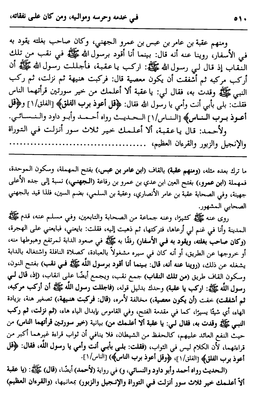 ومنهم عقبة بن عامر بن عبس بن عمرو الجهني، وكان صاحب بغلته يقود به في الأسفار، روينا عنه أن قال: بينما أنا أقود برسول الله صلى الله عليه وسلم في نقب من تلك النقاب إذ قال لي رسول الله صلى الله عليه وسلم: "اركب يا عقبة"، فأجللت رسول الله صلى الله عليه وسلم، أن أركب مركبه ثم أشفقت أن يكون معصية قال: فركبت هنيهة ثم نزلت، ثم ركب النبي صلى الله عليه وسلم وقدت به، فقال لي: "يا عقبة ألا أعلمك من خير سورتين قرأتهما الناس" فقلت: بلى بأبي أنت وأمي يا رسول الله فقال: "قل أعوذ برب الفلق، قل أعوذ برب الناس" الحديث رواه أحمد وأبو داود والنسائي. ولأحمد: قال: "يا عقبة، ألا أعلمك خير ثلاث سور أنزلت في التوراة والإنجيل والزبور والقرآن العظيم،