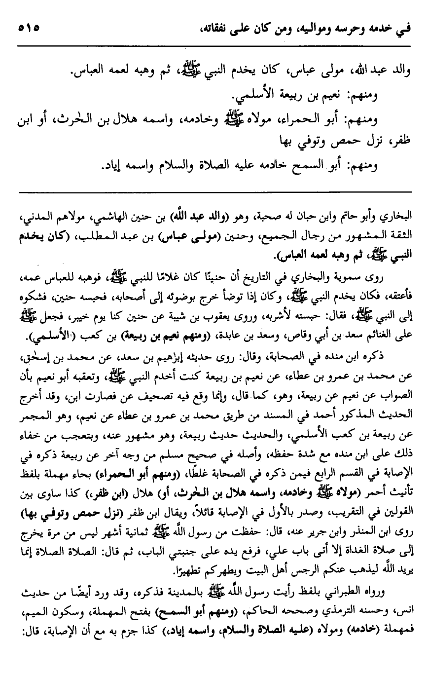 ذكره ابن منده في الصحابة، وقال: روى حديثه إبراهيم بن سعد، عن محمد بن إسحاق، عن محمد بن عمرو بن عطاء، عن نعيم بن ربيعة كنت أخدم النبي صلى الله عليه وسلم وتعقبه أبو نعيم بأن الصواب عن نعيم عن ربيعة وهو كما قال، وإنما وقع فيه تصحيف عن فصارت ابن، وقد أخرج الحديث المذكور أحمد في المسند من طريق محمد بن عمرو بن عطاء عن نعيم وهو المجمر عن ربيعة بن كعب الأسلمي، والحديث حديث ربيعة وهو مشهو عنه ويتعجب من خفاء ذلك على ابن منده مع شدة حفظه، وأصله في صحيح مسلم من وجه آخر عن ربيعة ذكره في الإصابة في القسم الرابع فيمن ذكره في الصحابة غلطا، ومنهم "أبو الحمراء" بحاء مهملة بلفط تأنيث أحمر "مولاه صلى الله عليه وسلم وخادمه، واسمه هلال بن الحارث، أو" هلال "ابن ظفر"، كذا ساوى بين القولين في التقريب، وصدر بالأول في الإصابة قائلا، ويقال ابن ظفر "نزل حمص وتوفي بها" وروى ابن المنذر وابن جرير عنه، قال: حفظت من رسول الله صلى الله عليه وسلم ثمانية أشهر ليس من مرة يخرج إلى صلاة الغداة إلا أتى باب علي، فرفع يده على جنبتي الباب، ثم قال: "الصلاة الصلاة إنما يريد الله ليذهب عنكم الرجس أهل البيت ويطهركم تطهيرا".