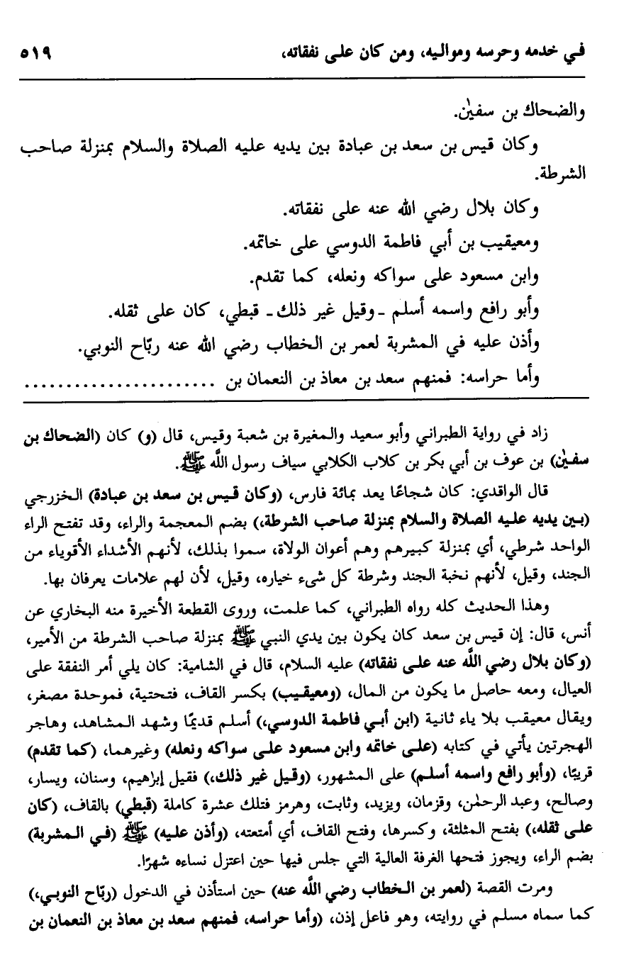 وهذا الحديث كله رواه الطبراني، كما علمت، وروى القطعة الأخيرة منه البخاري عن أنس، قال: إن قيس بن سعد كان يكون بين يدي النبي صلى الله عليه وسلم بمنزلة صاحب الشرطة من الأمير، "وكان بلال رضي الله عنه على نفقاته" عليه السلام، قال في الشامية: كان يلي أمر النفقة على العيال، ومعه حاصل ما يكون من المال، "ومعيقيب" بكسر القاف، فتحتية، فموحدة مصغر، ويقال معيقب بلا ياء ثانية "ابن أبي فاطمة الدوسي" أسلم قديما وشهد المشاهد، وهاجر الهجرتين يأتي في كتابه "على خاتمه وابن مسعود على سواكه ونعله" وغيرهما، "كما تقدم" قريبا، "وأبو رافع واسمه أسلم" على المشهور، "وقيل غير ذلك" فقيل إبراهيم، وسنان، ويسار، وصالح، وعبد الرحمن، وقزمان، ويزيد، وثابت، وهرمز فتلك عشرة كاملة "قبطي" بالقاف، "كان على ثقله" بفتح المثلثة، وكسرها، وتح القاف، أي أمتعته، "وأذن عليه" صلى الله عليه وسلم "في المشربة" بضم الراء، ويجوز فتحها الغرفة العالية التي جلس فيها حين اعتزل نساءه شهرا.