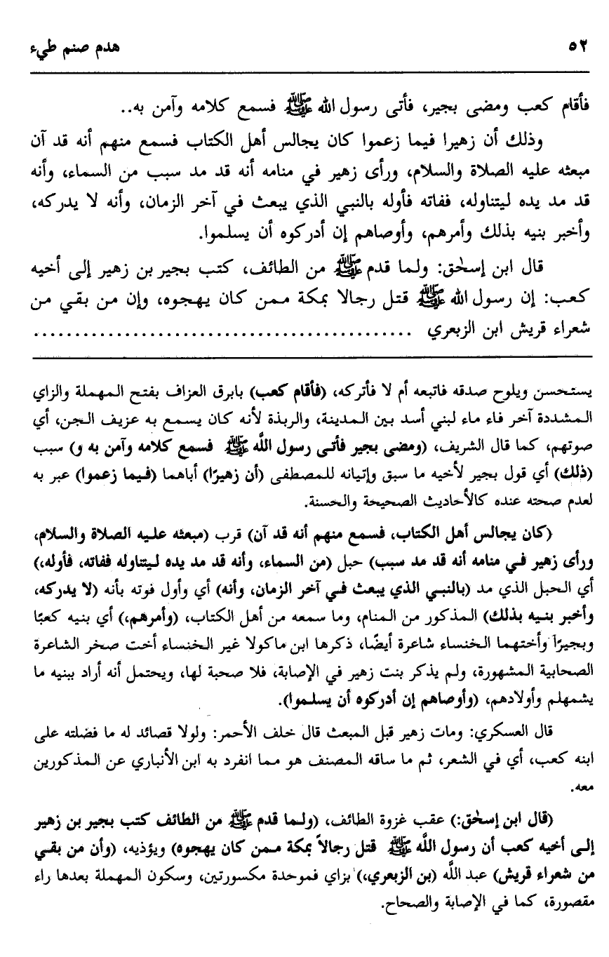 "كان يجالس أهل الكتاب، فسمع منهم أنه قد آن" قرب "مبعثه عليه الصلاة والسلام، ورأي زهير في منامه أنه قد مد سبب،" حبل "من السماء وأنه قد مد يده ليتناوله ففاته فأوله،" أي الحبل الذي مد "بالنبي الذي يبعث في آخر الزمان، وأنه" أي وأول فوته بأنه "لا يدركه، وأخبر بنيه بذلك" المذكور من المنام، وما سمعه من أهل الكتاب "وأمرهم" أي بنيه كعبا وبجيرا وأختهما الخنساء شاعرة أيضًا، ذكرها ابن ماكولا غير الخنساء أخت صخر الشاعرة الصحابية المشهورة، ولم يذكر بنت زهير في الإصابة، فلا صحبة لها، ويحتمل أنه أراد ببنيه ما يشملهم وأولادهم، "وأوصاهم إن أدركوه أن يسلموا".
