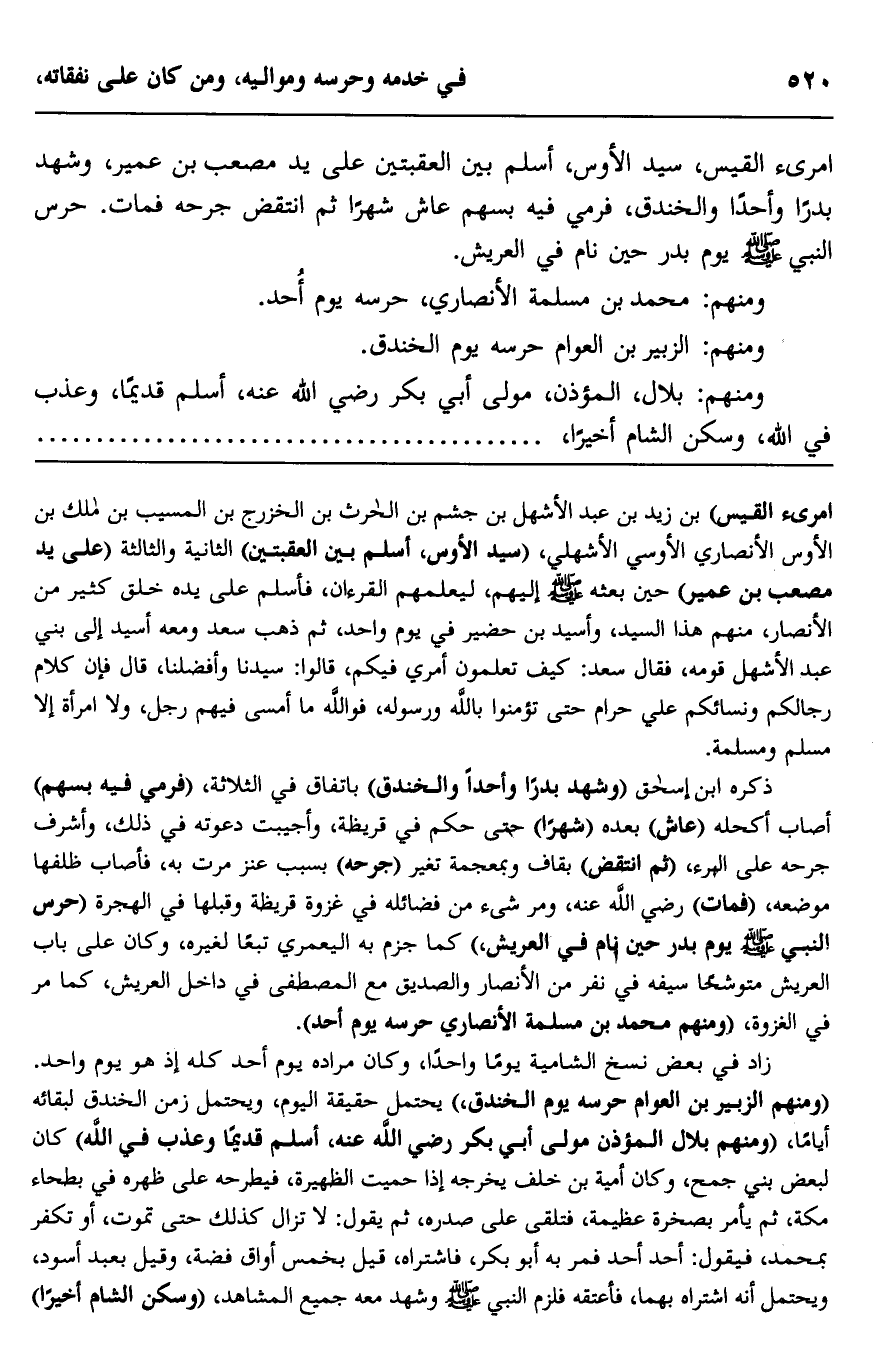 زاد في بعض نسخ الشامية يوما واحدا، وكان مراده يوم أحد كله إذ هو يوم واحد. "ومنهم الزبير بن العوام حرسه يوم الخندق" يحتمل حقيقة اليوم، ويحتمل زمن الخندق لبقائه أياما، "ومنهم بلال المؤذن مولى أبي بكر رضي الله عنه، أسلم قديما وعذب في الله" كان لبعض بني جمح، وكان أمية بن خلفة يخرجه إذا حميت الظهيرة، فيطرحه على ظهره في بطحاء مكة، ثم يأمر بصخرة عظيمة، فتلقى على صدره، ثم يقول: لا تزال كذلك حتى تموت، أو تكفر بمحمد، فيقول: أحد أحد فمر به أبو بكر، فاشتراه، قيل بخمس أواق فضة، وقيل بعبد أسود، ويحتمل أنه اشتراه بها، فأعتقه فلزم النبي صلى الله عليه وسلم وشهد معه جميع المشاهد، "وسكن الشام أخيرا".