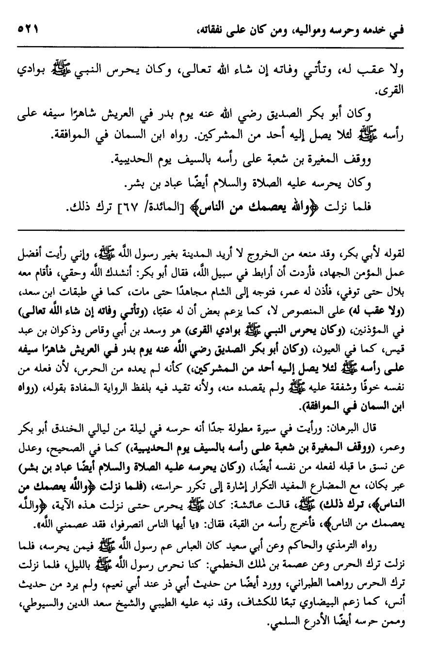 قال البرهان: ورأيت في سيرة مطولة جدا أنه حرسه في ليلة من ليالي الخندق أبو بكر وعمر، "ووقف المغيرة بن شعبة على رأسه بالسيف يوم الحديبية" كما في الصحيح، وعدل عن نسق ما قبله لفعله من نفسه أيضا، وكان يحرسه عليه الصلاة والسلام أيضا عباد بن بشر" عبر بكان، مع المضارع المفيد التكرار إشارة إلى تكرر حراسته، "فلما نزلت {وَاللَّهُ يَعْصِمُكَ مِنَ النَّاسِ} ، ترك ذلك صلى الله عليه وسلم، قالت عائشة: كان صلى الله عليه وسلم يحرس حتى نزلت هذه الآية، {وَاللَّهُ يَعْصِمُكَ مِنَ النَّاسِ} ، فأخرج رأسه من القبة. فقال: "يا أيها الناس انصرفوا فقد عصمني الله".