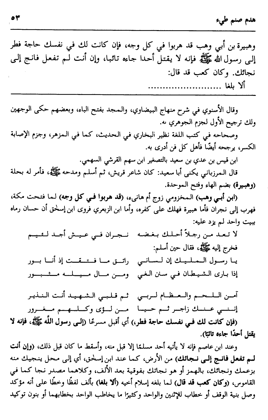 وهبيرة بن أبي وهب قد هربوا في كل وجه، فإن كانت لك في نفسك حاجة فطر إلى رسول الله صلى الله عليه وسلم، فإنه لا يقتل أحدا جاءه تائبا، وإن أنت لم تفعل فانج إلى نجائك، وكان كعب قد قال: