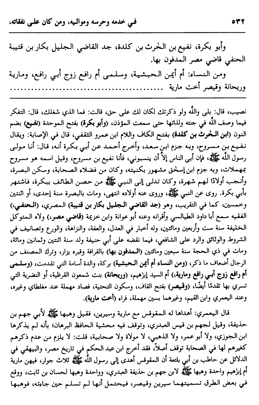 نصيب قال: بلى والله ولو ذكرتك لكان لك علي حق، قالت: فما الذي شغلك، قال: التفكر فيما وصف الله في جنته ولذاتها حتى سمعت المؤذن "أبو بكرة" بفتح الموحدة "نفيع" بضم النون "ابن الحارث بن كلدة" بفتح الكاف واللام ابن عمرو الثقفي، قال في الإصابة: ويقال نفيع بن مسروح، وبه جزم ابن سعد، وأخرج أحمد عن أبي بكرة أنه قال: أنا مولى رسول الله صلى الله الله عليه وسلم فإن أبى الناس إلا أن ينسبوني، فأنا نفيع بن مسروح، وقيل اسمه هو مسروح بمهملات، وبه جزم ابن إسحاق مشهور بكنيته، وكان من فضلاء الصحابة، وسكن البصرة، وأنجب أولادا لهم شهرة، وكان تدلى إلى النبي صلى الله عليه وسلم من حصن الطائف ببكرة، فاشتهر بأبي بكرة، روى عن النبي صلى الله عليه وسلم وروى عنه أولاده انتهى، ومات بالبصرة سنة إحدى، أو اثنتين وخمسين، كما في التقريب، وهو "جد القاضي الجليل بكار بن قتيبة" المصري، "الحنفي"، الفقيه سمع أبا داود الطيالسي وأقرانه وعنه أبو عوانة وابن خزيمة "قاضي مصر" ولاه المتوكل الخليفة سنة ست وأربعين ومائتين، وله أخبار في العدل، والعفة، والنزاهة، والورع وتصانيف في الشروط والوثائق والرد على الشافعي، فيما نقضه على أبي حنيفة ولد سنة اثنتين وثمانين ومائة، ومات في ذي الحجة على الشافعة فيما نقضه على أبي حنيفة ولد سنة اثنتين وثمانين ومائة، ومات في ذي الحجة سنة سبعين ومائتين "المدفون بها" بالقرافة وقبره يزار، وترك المصنف من الرجال أضعاف ما ذكر، "ومن النساء أم أيمن الحبشية" بركة، والدة أسامة التي تقدمت، "وسلمى أم رافع زوج أبي رافع ومارية" أم السيد إبراهيم، "وريحانة بنت شمعون القرظية، أو النضرية التي تسري بها تقدما أيضا، "وقيصر" بفتح القاف، وسكون التحتية، فصاد مهملة عند مغلطاي وغيره، وعند اليعمري وابن القيم، وغيرهما بسين مهملة، فراء "أخت مارية".
