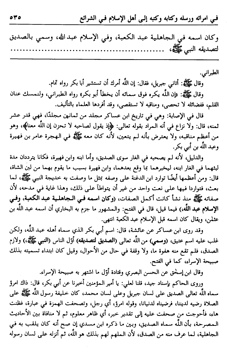 وروى الحاكم بإسناد جيد قلنا لعلي يا أمير المؤمنين أخبرنا عن أبي بكر، قال: ذاك امرؤ سماه الله تعالى الصديق على لسان جبريل وعلى لسان محمد، كان خليفة رسول الله صلى الله عليه وسلم على الصلاة رضيه لديننا فرضيناه لدنيانا، وقوله امرؤ، أي رجل، وتصحفت الهمزة في عبارة، فظنت هاء، فأحوجت من صحفت عليه إلى تقدير خبر، أي ظاهر معلوم، ثم لا منافاة بين الأحاديث المصرحة، بأن الله سماه الصديق وبين ما ذكره ابن مسدي إن صح أنه كان يلقب به في الجاهلية، لما عرف منه من الصدق؛ لأن الملهم لهم بذلك هو الله، ثم أنزله على لسان رسوله
