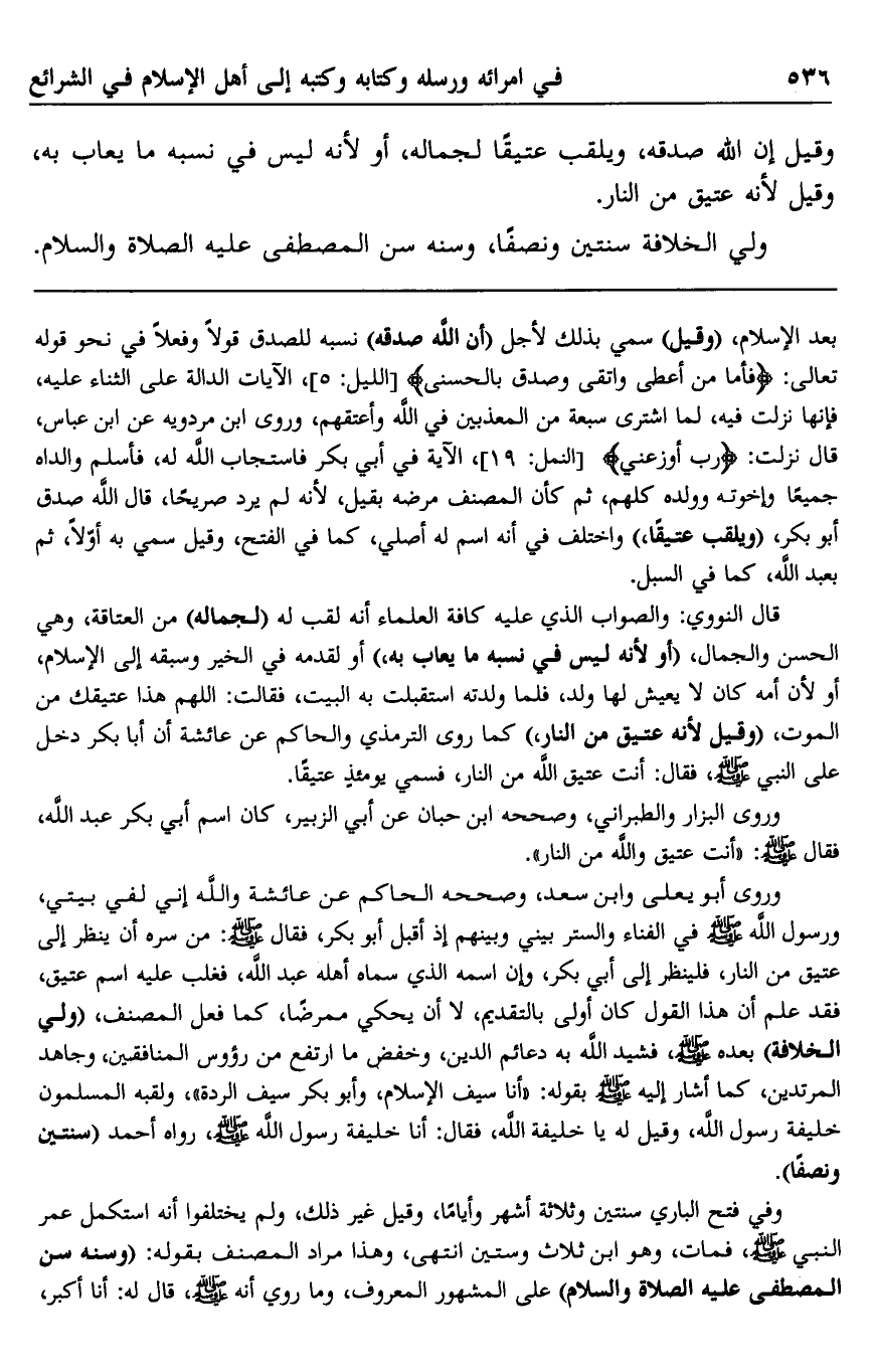 وقيل إن الله صدقه، ويلقب عتيقا لجماله، أو لأنه ليس في نسبه ما يعب به، وقيل لأنه عتيق من النار.