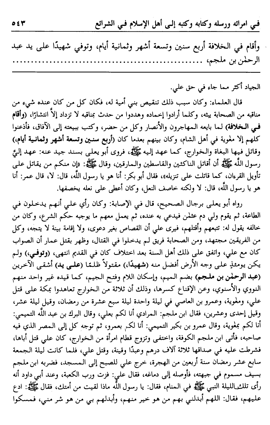 وأقام في الخلافة أربع سنين وتسعة أشهر وثمانية أيام، وتوفي شهيدا على يد عبد الرحمن بن ملجم،
