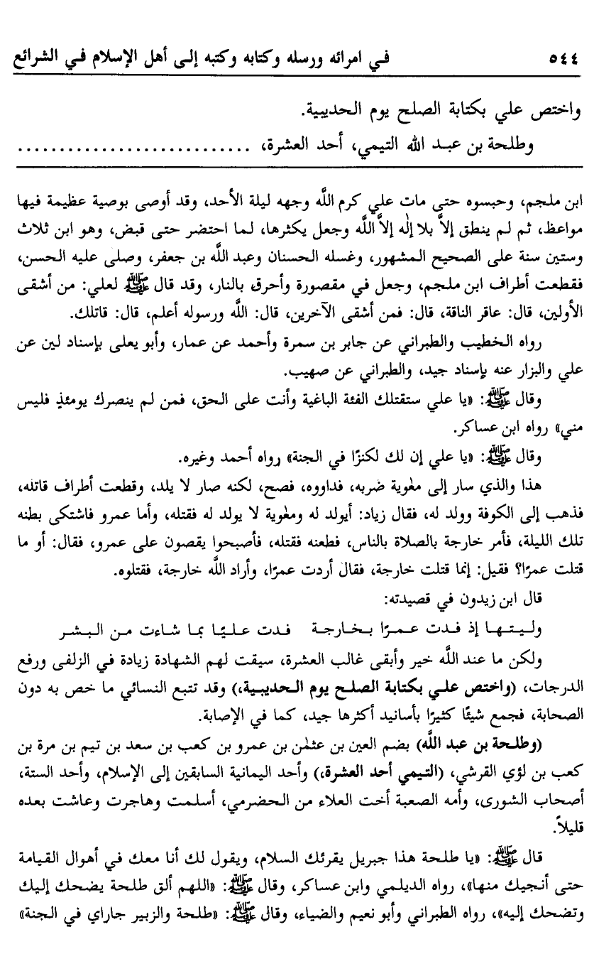 ولكن ما عند الله خير وأبقى غالب العشرة، سيقت لهم الشهادة زيادة في الزلفى ورفع الدرجات، "واختص علي بكتابة الصلح يوم الحديبية" وقد تتبع النسائي ما خص به دون الصحابة، فجمع شيئا كثيرا بأسانيد أكثرها جيد، كما في الإصابة.