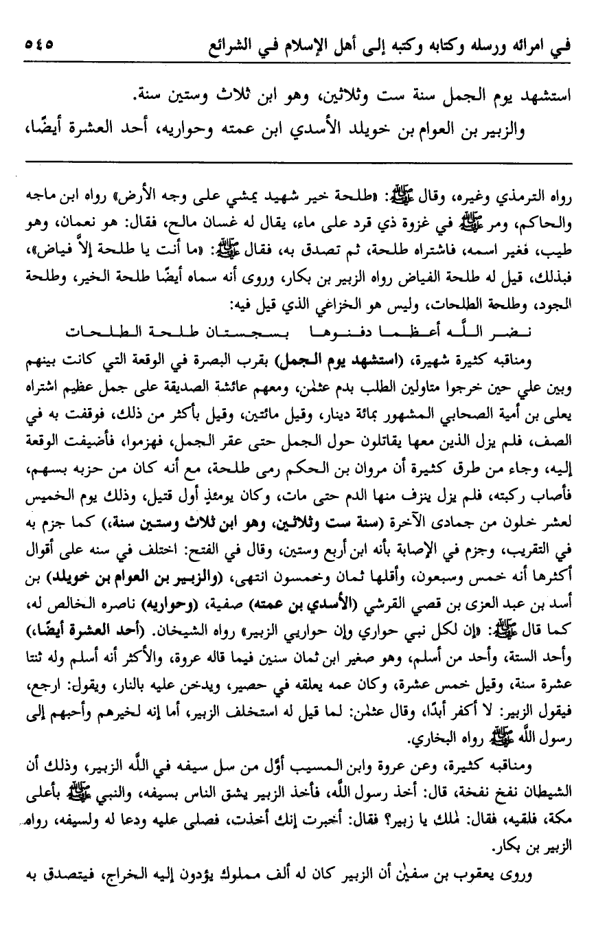 ومناقبه كثيرة شهيرة، "استشهد يوم الجمل" بقرب البصرة في الوقعة التي كانت بينهم وبين علي حين خرجوا متاولين الطلب بدم عثمان، ومعهم عائشة الصديقة على جمل عظيم اشتراه يعلى بن أمية الصحابي المشهور بمائة دينار، وقيل مائتين وقيل بأكثر من ذلك فوقفت به في الصف، فلم يزل الذين معها يقاتلون حول الجمل حتى عقر الجمل، فهزموا فأضيفت الوقعة إليه، وجاء من طرق كثيرة أن مروان بن الحكم رمى طلحة، مع أنه كان من حزبه بسهم فأصاب ركبته، فلم يزل ينزف منها الدم حتى مات، وكان يؤمئذ أول قتيل، وذلك يوم الخميس لعشر خلون من جمادى الآخرة "سنة ست وثلاثين وهو ابن ثلاث وستين سنة" كما جزم به في التقريب، وجزم في الإصابة بأنه ابن أربع وستين، وقال في الفتح: اختلف في سنه على أقوال أكثرها أنه خمس وسبعون، أقلها ثمان وخمسون انتهى، "والزبير بن العوام بن خويلد" بن أسد بن عبد العزى بن قصي القرشي "الأسدي ابن عمته" صفية، "وحواريه" ناصره الخالص له، كما قال صلى الله عليه وسلم: "إن لكل نبي حواري وإن حواري الزبير" رواه الشيخان: أحد العشرة أيضا، وأحد الستة، وأحد من أسلم وهو صغير ابن ثمان سنين فيما قاله عروة، والأكثر أنه أسلم وله ثنتا عشرة سنة وقيل خمس عشرة، وكان عمه يعلقه في حصير، ويدخن عليه بالنار، ويقول: ارجع فيقول الزبير: لا أكفر أبدا، وقال عثمان: لما قيل له استخلف الزبير، أما إنه لخيرهم وأحبهم إلى رسول الله صلى الله عليه وسلم رواه البخاري.