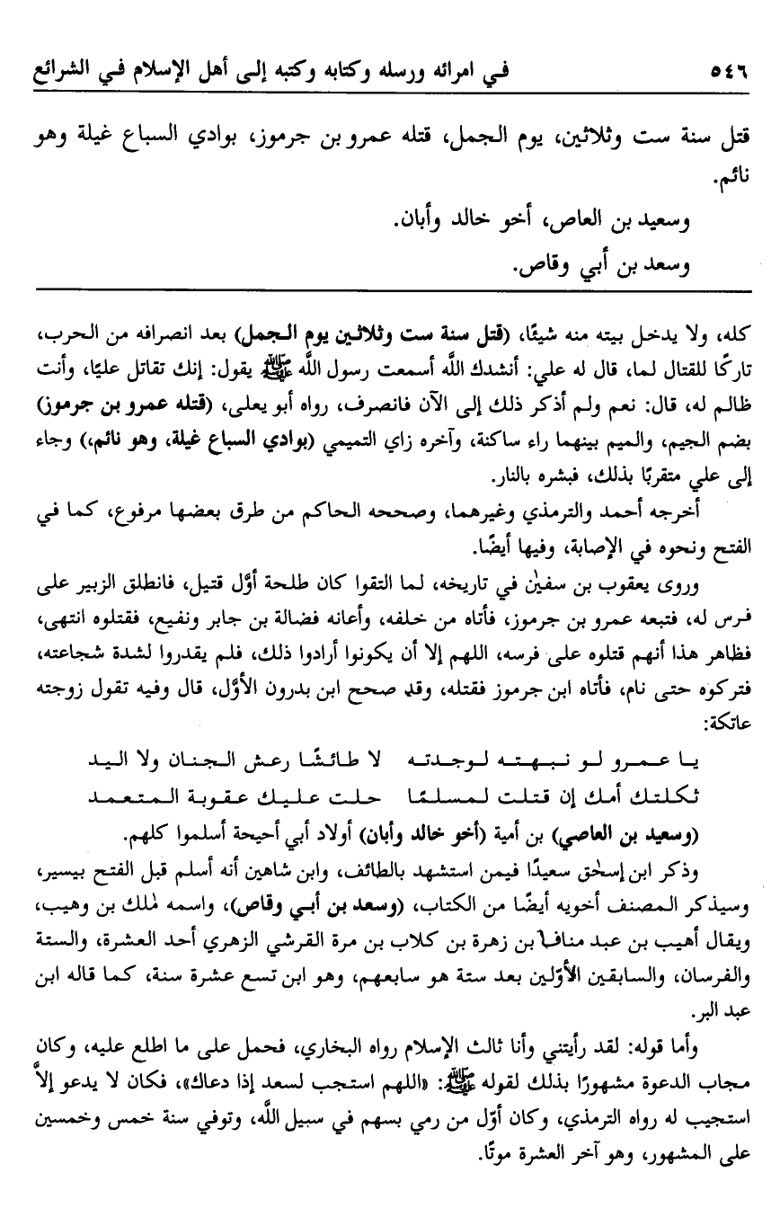 كله ولا يدخل بيته من شيئا، "قتل سنة ست وثلاثين يوم الجمل، بعد انصرافه من الحرب، تاركا للقتال لما قال له علي: أنشدك الله أسمعت رسول الله صلى الله عليه وسلم يقول: "إنك تقاتل عليا وأنت ظالم له" قال: نعم ولم أذكر ذلك إلى الآن فانصرف، رواه أبو يعلى، "قتله عمرو بن جرموز". بضم الجيم والميم بينهما راء ساكنة، وآخره زاي التميمي "بوادي السباع غيلة، وهو نائم" وجاء إلى علي متقربا بذلك، فبشره بالنار.