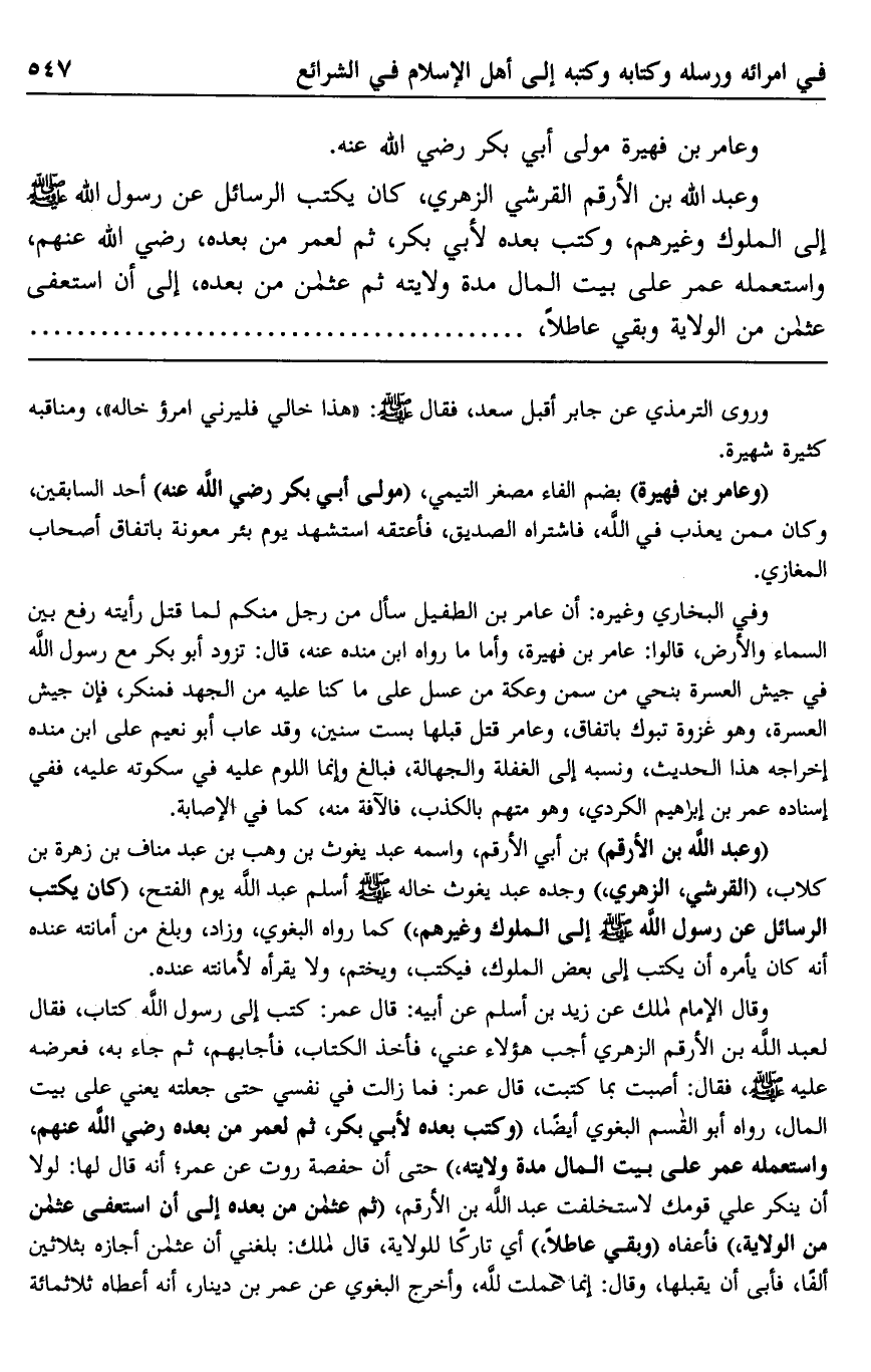 وعبد الله بن الأرقم القرشي الزهري، كان يكتب الرسائل عن رسول الله صلى الله عليه وسلم إلى الملوك وغيرهم، وكتب بعده لأبي بكر، ثم لعمر من بعده، رضي الله عنهم، واستعمله عمر على بيت المال مدة ولايته، ثم عثمان من بعده إلى أن استعفى عثمان من الولاية وبقي عاطلا،