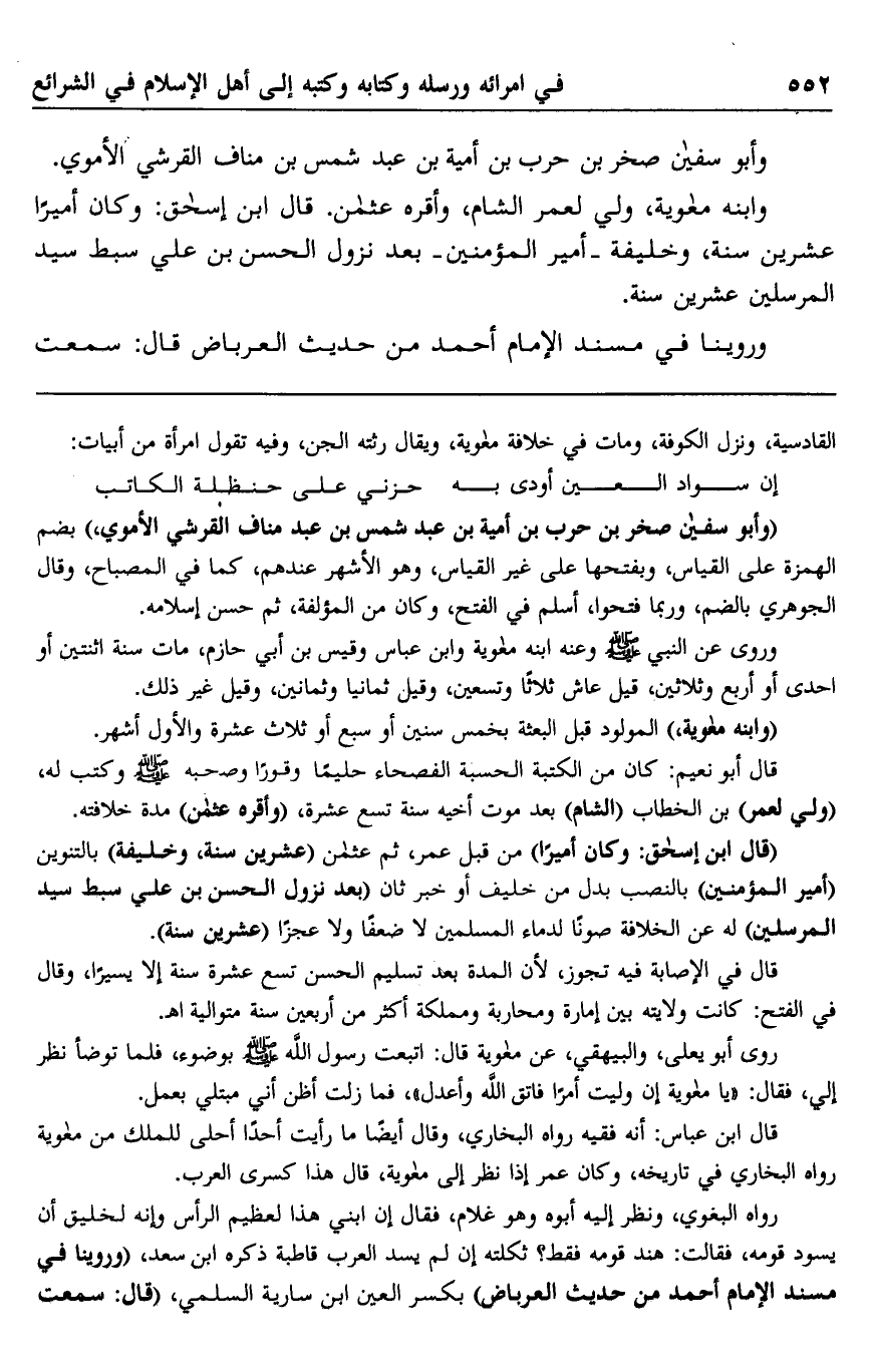 رواه البغوي، ونظر إليه أبوه وهو غلام، فقال إن ابني هذا لعظيم الرأس وإنه لخليق أن يسود قومه، فقالت: هند قومه فقط؟ ثكلته إن لم يسد العرب قاطبة ذكره ابن سعد، "وروينا في مسند الإمام أحمد من حديث العرباض" بكسر العين ابن سارية السلمي، "قال: سمعت