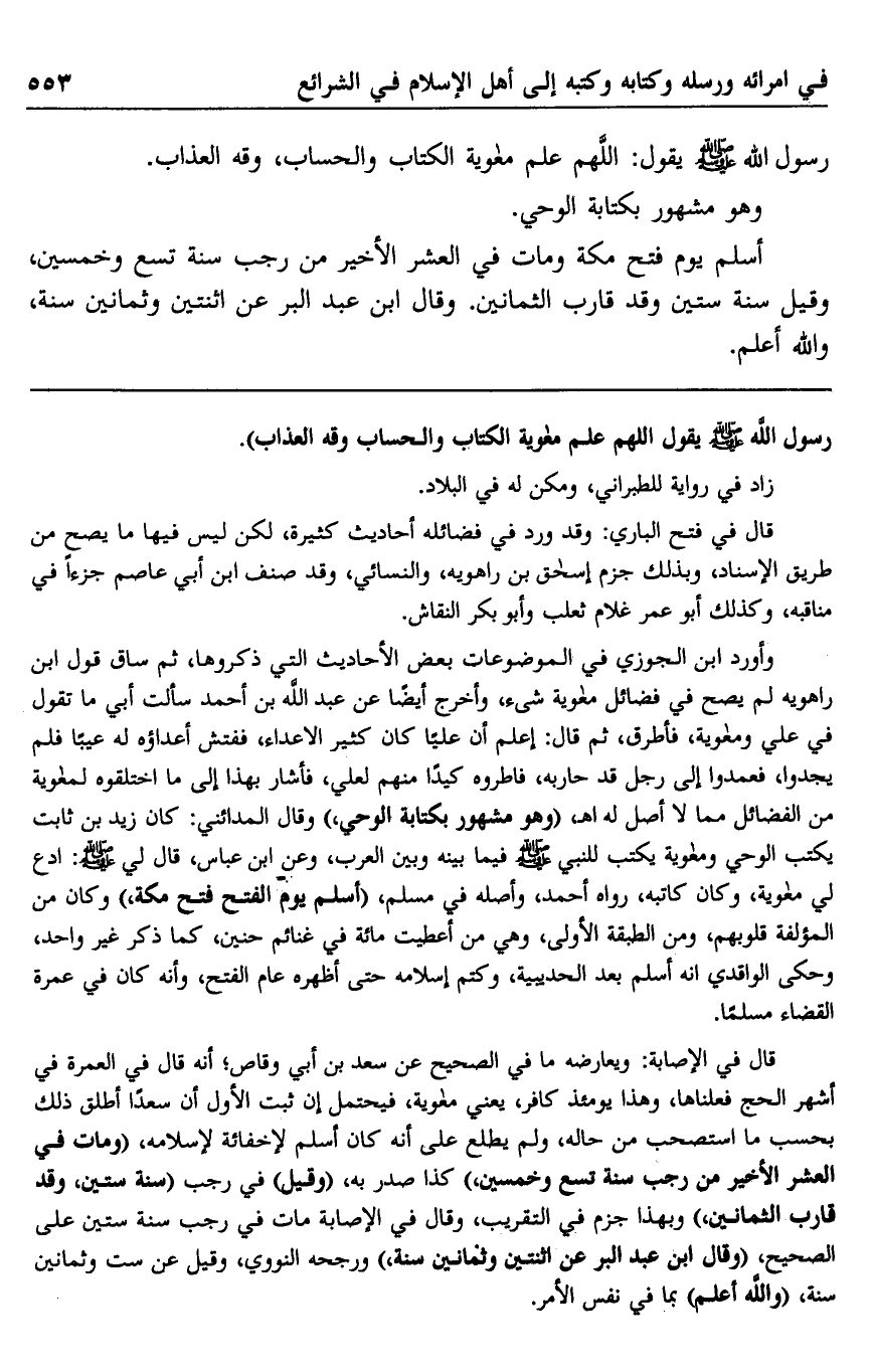 رسول الله صلى الله عليه وسلم: "اللهم علم معاوية الكتاب والحساب وقه العذاب".