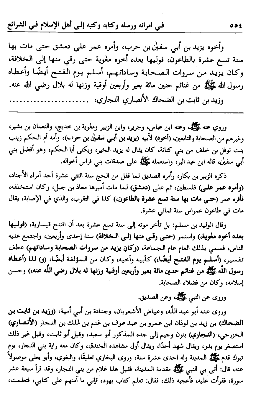 وقال الوليد بن مسلم: بل تأخر موته إلى سنة تسع عشرة بعد أن افتتح قيسارية، "فوليها بعده أخوه معاوية" واستمر "حتى رقي منها إلى الخلافة" سنة إحدى وأربعين واجتمع عليه الناس فسمي بذلك العام عام الجماعة "وكان يزيد من سروات الصحابة وساداتهم" عطف تفسير، "أسلم يوم الفتح أيضا" كأبي وأخيه، وكان من المؤلفة أيضا، "و" لذا "أعطاه رسول الله صلى الله عليه وسلم من غنائم حنين مائة بعير وأربعين أوقية وزنها له بلال رضي الله عنه" وحسن إسلامه، وكان من فضلاء الصحابة.