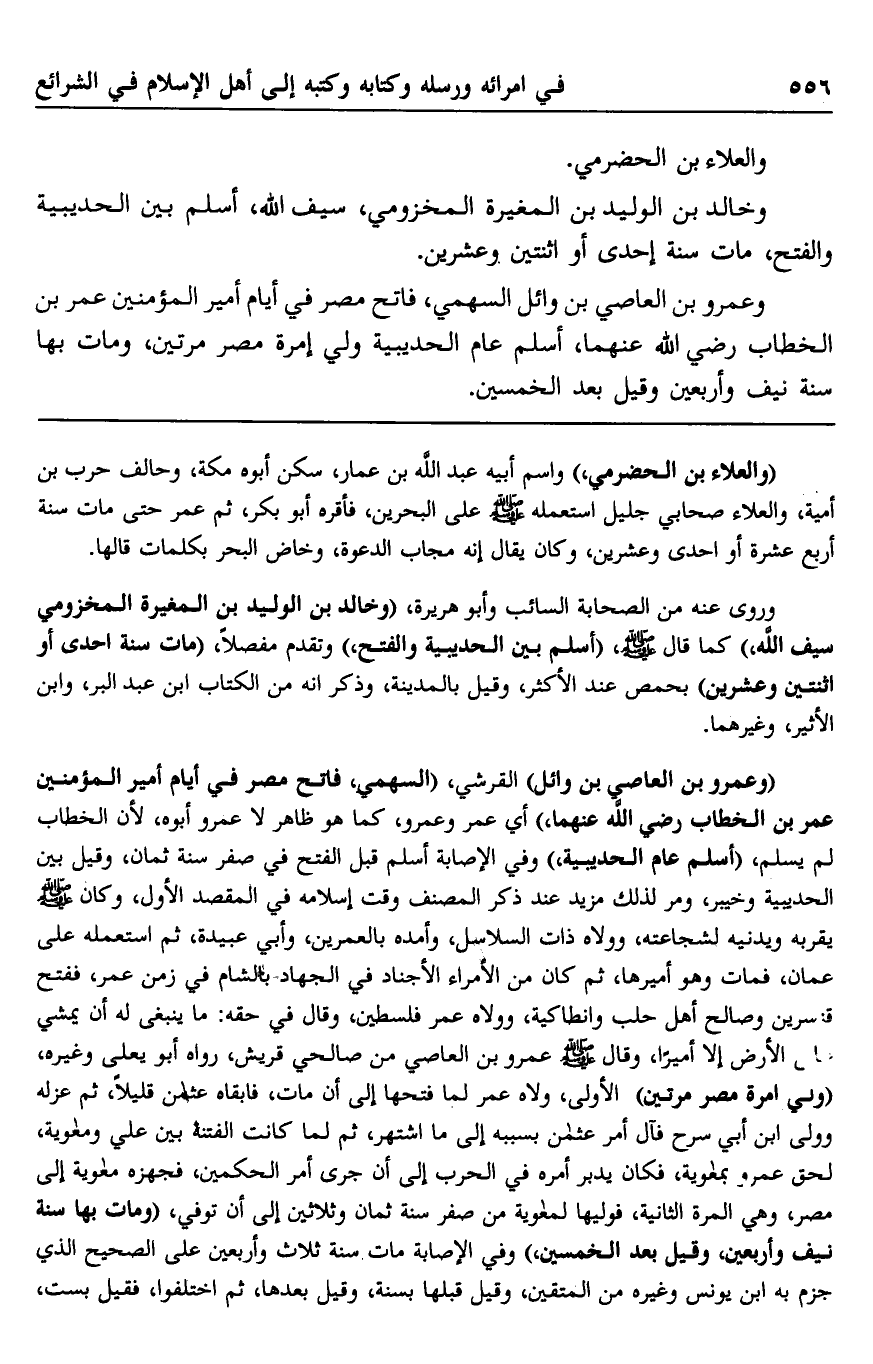 وعمرو بن العاص بن وائل السهمي، فاتح مصر في أيام أمير المؤمنين عمر بن الخطاب رضي الله عنهما، أسلم عام الحديبية ولي إمرة مصر مرتين، ومات بها سنة نيف وأربعين وقيل بعد الخمسين.