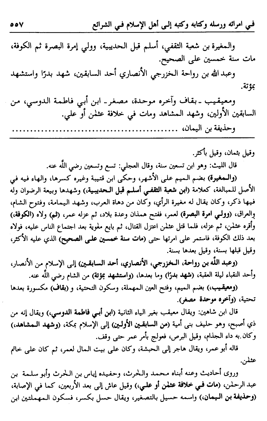 والمغيرة بن شعبة الثقفي، أسلم قبل الحديبية، وولي إمرة البصرة ثم الكوفة، مات سنة خمسين على الصحيح.