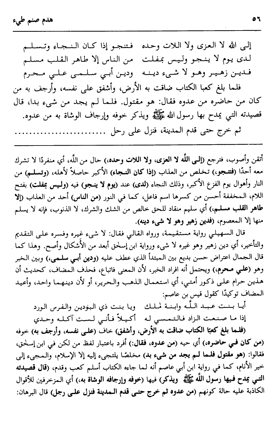 أتقن وأصوب، فترجح "إلى الله لا العزى، ولا اللات وحده" حال من الله، أي منفردا لا تشرك معه أحدا "فتنجو" تخلص من العذاب "إذا كان النجاء" الأكبر حاصلا لأهله، "وتسلم" من النار وأهوال يوم الفزع الأكبر، وذلك النجاء "لدى" عند "يوم لا ينجو" فيه، "وليس بمفلت" بفتح اللام المخففة أحسن من كسرها اسم فاعل، كما في النور "من الناس" أحد من العذاب "إلا طاهر القلب مسلم،" أي سليم منقاد للحق خالص من الشك والشرك، لا الذنوب، فإنه لا يسلم منها إلا المعصوم، "فدين زهير وهو لا شيء دينه".