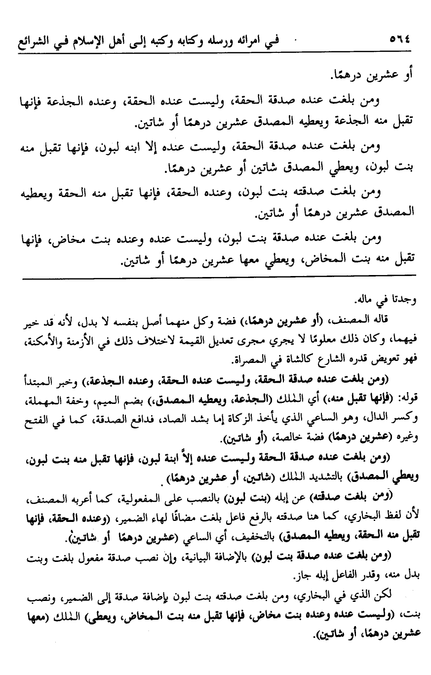 لكن الذي في البخاري، ومن بلغت صدقته بنت لبون بإضافة صدقة إلى الضمير، ونصب بنت، "وليست عنده وعنده بنت مخاض، فإنها تقبل منه بنت المخاض، ويعطي" المالك "معها عشرين درهما، أو شاتين".