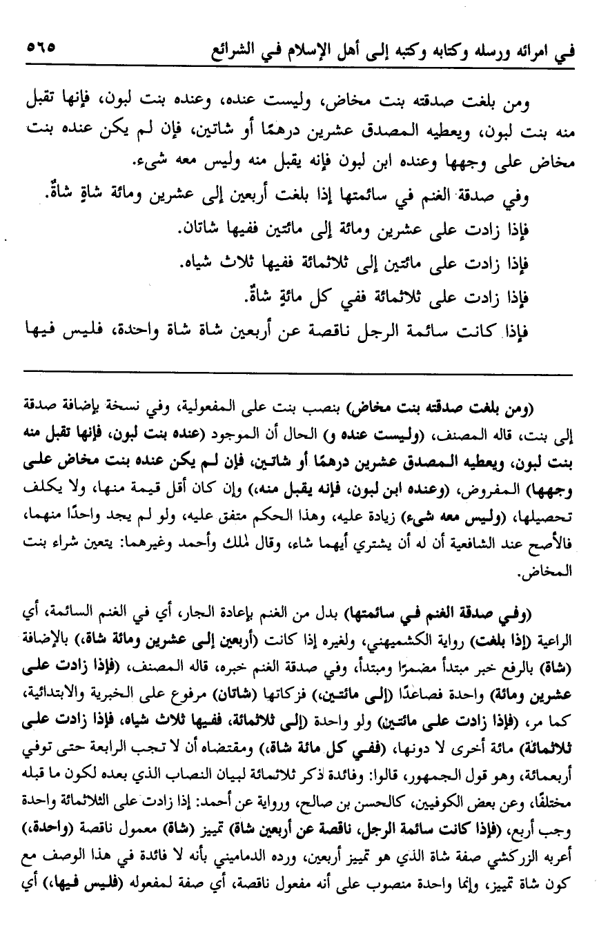 وفي صدقة الغنم في سائمتها إذا بلغت أربعين إلى عشرين ومائة شاةٍ شاةٌ.