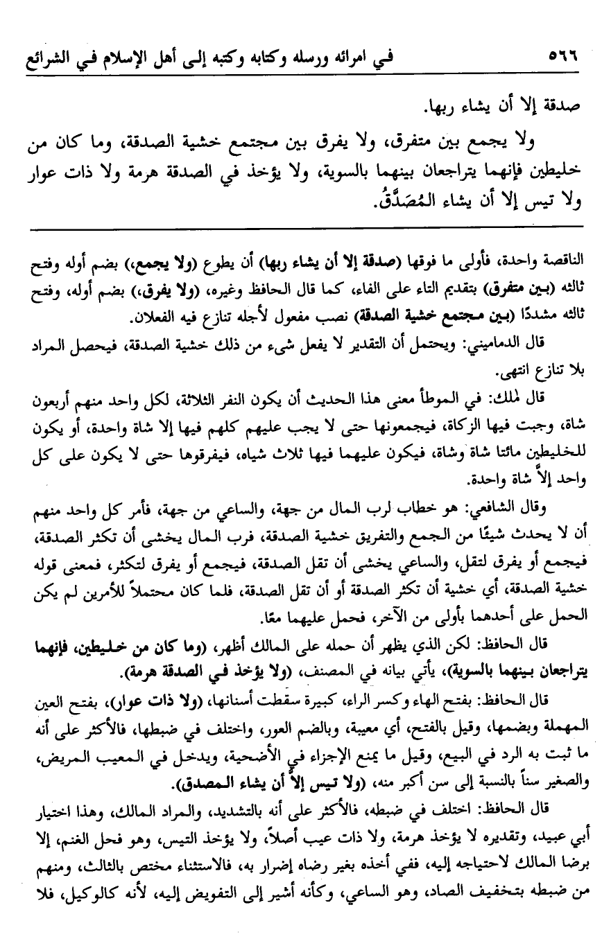 ولا يجمع بين متفرق، ولا يفرق بين مجتمع خشية الصدقة، وما كان من خليطين فإنهما يتراجعان بينهما بالسوية، ولا يؤخذ في الصدقة هرمة ولا ذات عوار ولا تيس إلا أن يشاء المصدق.