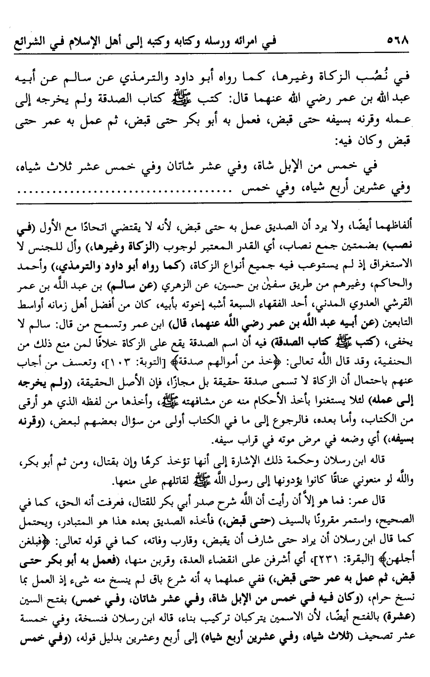 في نصب الزكاة وغيرها، كما رواه أبو داود والترمذي عن سالم عن أبيه عبد الله بن عمر رضي الله عنهما قال: كتب صلى الله عليه وسلم كتاب الصدقة ولم يخرجه إلى عمله وقرنه بسيفه حتى قبض، فعمل به أبو بكر حتى قبض، ثم عمل به عمر حتى قبض وكان فيه: