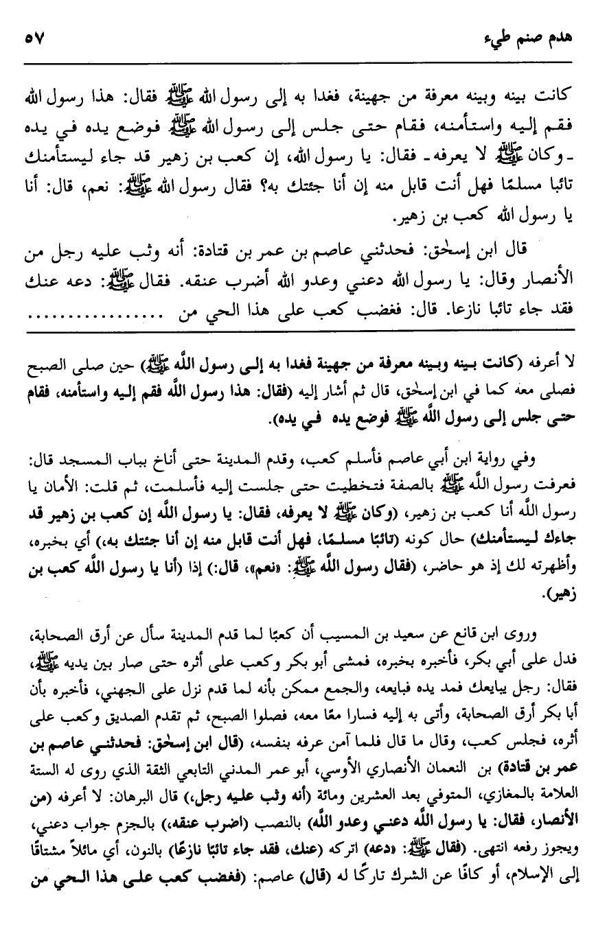 وروى ابن قانع عن سعيد بن المسيب أن كعبا لما قدم المدينة سأل عن أرق الصحابة، فدل على أبي بكر، فأخبره بخبره، فمشى أبو بكر وكعب على أثره حتى صار بين يديه صلى الله عليه وسلم، فقال: رجل يبايعك فمد يده فبايعه، والجمع ممكن بأنه لما قدم نزل على الجهني، فأخبره بأن أبا بكر أرق الصحابة، وأتى به إليه فسارا معا معه، فصلوا الصبح، ثم تقدم الصديق وكعب على أثره، فجلس كعب، وقال ما قال فلما آمن عرفه بنفسه، "قال ابن إسحاق: فحدثني عاصم بن عمر بن قتادة" بن النعمان الأنصاري الأوسي، أبو عمر المدني التابعي الثقة الذي روى له الستة العلامة بالمغازي، المتوفى بعد العشرين ومائة "أنه وثب عليه رجل،" قال البرهان: لا أعرفه "من الأنصار، فقال: يا رسول الله دعني وعدو الله" بالنصب "أضرب عنقه" بالجزم جواب دعني، ويجوز رفعه. ا. هـ. "فقال صلى الله عليه وسلم "دعه" اتركه "عنك، فقد جاء تائبا نازعا" بالنون، أي مائلا مشتاقا إلى الإسلام، أو كافا عن الشرك تاركا له: "قال" عاصم: "فغضب كعب على الحي من