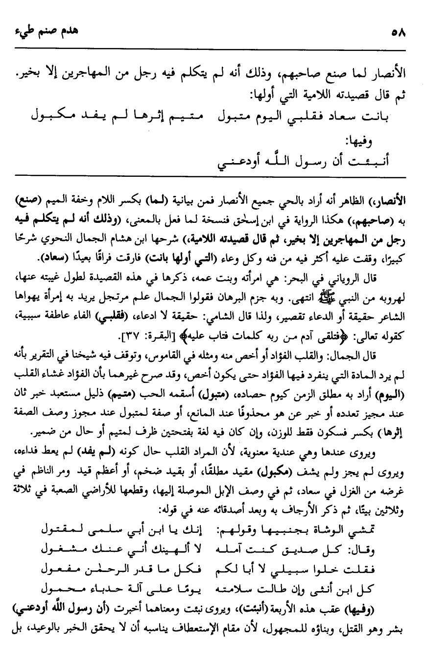 الأنصار،" الظاهر أنه أراد بالحي جميع الأنصار فمن بيانية "لما" بكسر اللام وخفة الميم "صنع" به "صاحبهم"، هكذا الرواية في ابن إسحاق فنسخة لما فعل بالمعنى، وذلك أنه لم يتكلم فيه رجل من المهاجرين إلا بخير، ثم قال قصيدته اللامية،" شرحها ابن هشام الجمال النحوي شرحا كبيرا، وقفت عليه أكثر فيه من فئة وكل وعاء "التي أولها بانت" فارقت فراقا بعيدا "سعاد".