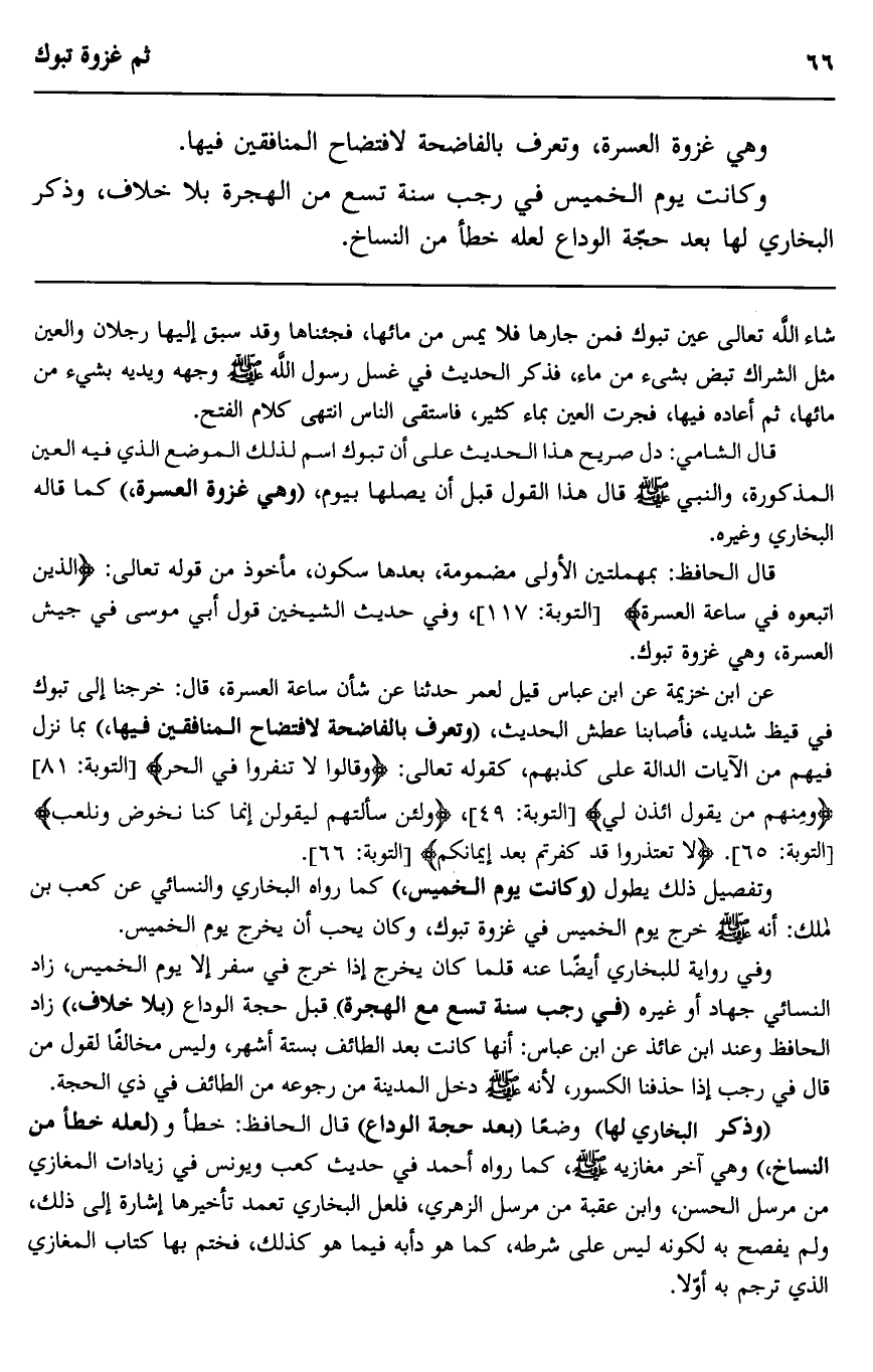 عن ابن خزيمة عن ابن عباس قيل لعمر حدثنا عن شأن ساعة العسرة، قال: خرجنا إلى تبوك في قيظ شديد، فأصابنا عطش الحديث، "وتعرف بالفاضحة لافتضاح المنافقين فيها، بما نزل فيهم من الآيات الدالة على كذبهم، كقوله تعالى: {وَقَالُوا لَا تَنْفِرُوا فِي الْحَرِّ} [التوبة: 81] {وَمِنْهُمْ مَنْ يَقُولُ ائْذَنْ لِي} [التوبة: 49] ، {وَلَئِنْ سَأَلْتَهُمْ لَيَقُولُنَّ إِنَّمَا كُنَّا نَخُوضُ وَنَلْعَبُ} [التوبة: 65] {لا تَعْتَذِرُوا قَدْ كَفَرْتُمْ بَعْدَ إِمَانِكُمْ} [التوبة: 66] .