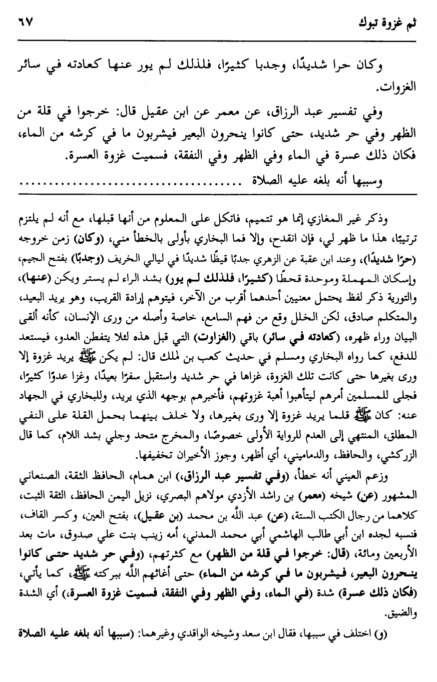 وفي تفسير عبد الرزاق عن معمر عن ابن عقيل قال: خرجوا في قلة من الظهر وفي حر شديد، حتى كانوا ينحرون البعير فيشربون ما في كرشه، من الماء، فكان ذلك عسرة في الماء وفي الظهر وفي النفقة، فسميت غزوة العسرة.