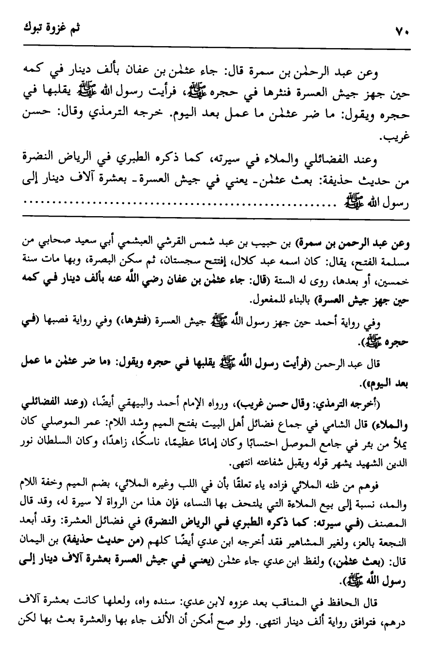 وعن عبد الرحمن بن سمرة قال: جاء عثمان بن عفان بألف دينار في كمه حين جهز جيش العسرة في حجرة صلى الله عليه وسلم، فرأيت رسول الله صلى الله عليه وسلم يقلبها في حجره ويقول: "ما ضر عثمان ما عمل بعد اليوم". خرجه الترمذي وقال: حسن غريب.