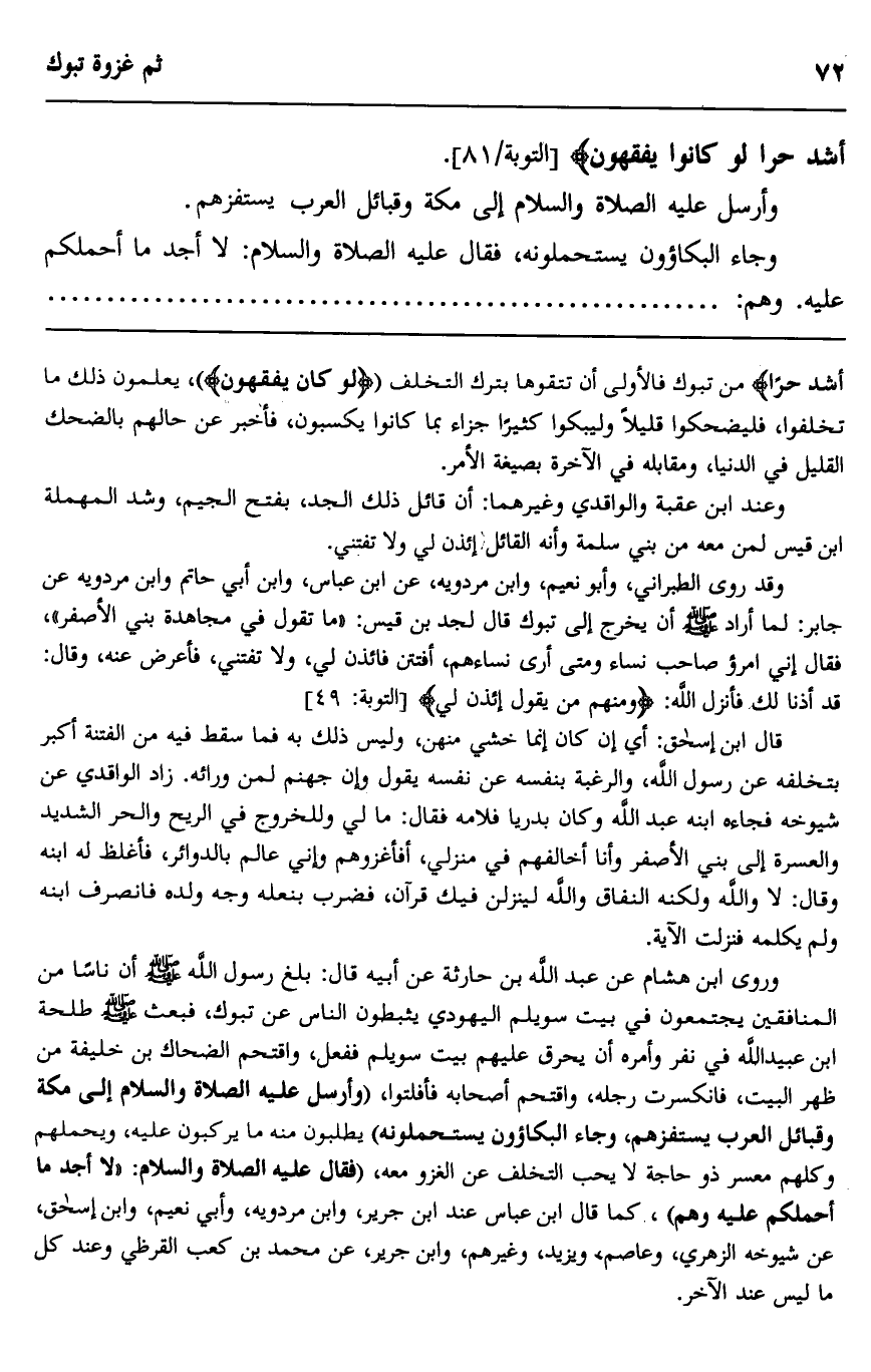 وروى ابن هشام عن عبد الله بن حارثة عن أبيه قال: بلغ رسول الله صلى الله عليه وسلم أن ناسًا من المنافقين يجتمعون في بيت سويلم اليهودي يثبطون الناس عن تبوك، فبعث صلى الله عليه وسلم طلحة بن عبيد الله في نفر وأمره أن يحرق عليهم بيت سويلم ففعل، واقتحم الضحاك بن خليفة من ظهر البيت، فانكسرت رجله، واقتحم أصحابه فأفلتوا، "وأرسل عليه الصلاة والسلام إلى مكة وقبائل العرب يستفزهم، وجاء البكاءون يستحملونه" يطلبون منه ما يركبون عليه، ويحملهم وكلهم معسر ذو حاجة لا يحب التخلف عن الغزو معه "فقال عليه الصلاة والسلام: "لا أجد ما أحملكم عليه" وهم" كما قال ابن عباس عند ابن جرير، وابن مردويه، وأبي نعيم، وابن إسحاق، عن شيوخه الزهري، وعاصم، ويزيد، وغيرهم، وابن جرير، عن محمد بن كعب القرظي وعند كل ما ليس عند الآخر.