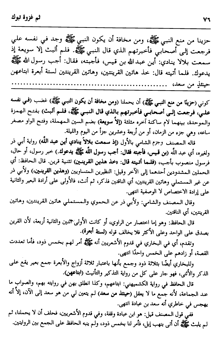 قال المصنف وجزم الشام بالأول "إذ سمعت بلالا ينادي أين عبد الله" رواية أبي ذر ولغيره، أي عبد الله "بن قيس، فأجبته فقال: أجب رسول الله صلى الله عليه وسلم يدعوك" خبر رسول، أو حال، فرسول منصوب بأجب، "فلما أتيته قال: "خذ هذين القرينين" تثنية قرين. قال الحافظ: أي الحملين المشدودين أحدهما إلى الآخر وقيل: النظيرين المتساويين "وهذين القرينين"، ولأبي ذر عن غير المستملي وهاتين القرينتين أي الناقتين فذكر، ثم أنث، فالأولى على أرادة البعير والثانية على إرادة الاختصاص لا الوصفية انتهى.