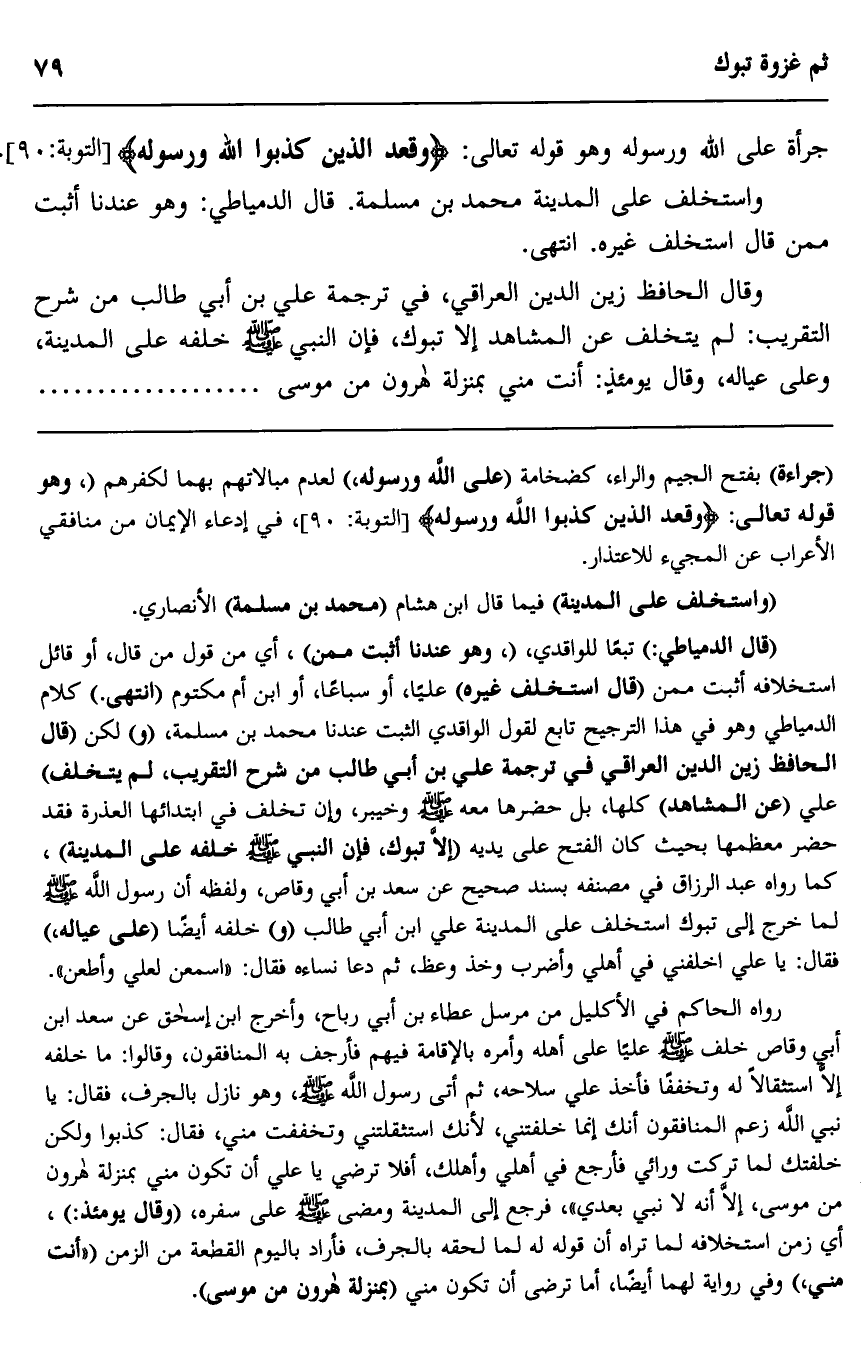 وقال الحافظ زين الدين العراقي، في ترجمة علي بن أبي طالب من شرح التقريب، لم يتخلف عن المشاهد إلا تبوك، فإن النبي صلى الله عليه وسلم خلفه على المدينة، وعلى عياله، وقال يومئذ: "أنت منى بمنزلة هارون من موسى