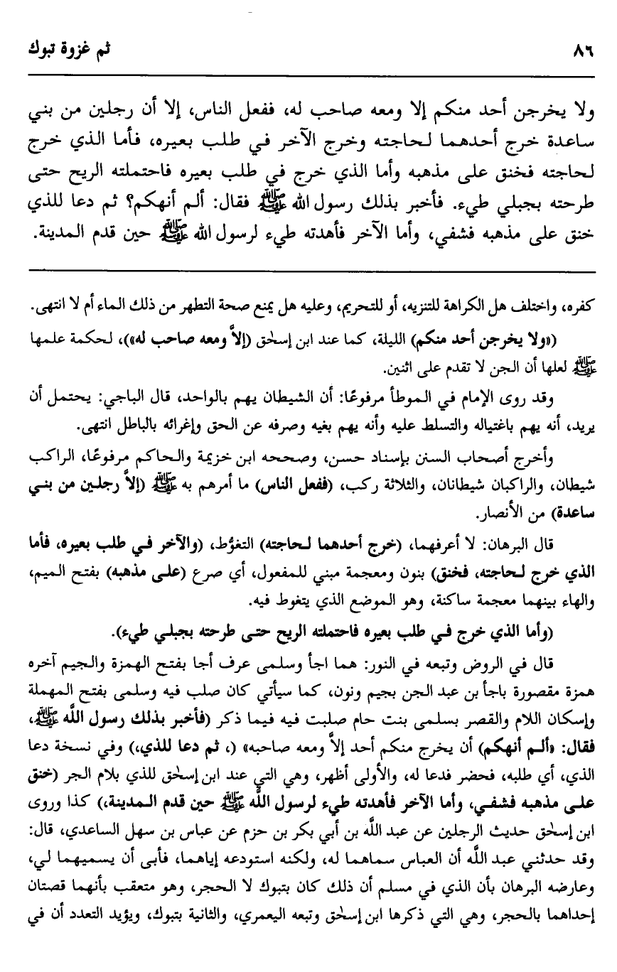 ولا يخرجن أحد منكم إلا ومعه صاحب له"، ففعل الناس، إلا أن رجلين من بني ساعدة خرج أحدهما لحاجته وخرج الآخر في طلب بعيره، فأما الذي خرج لحاجته فخنق على مذهبه وأما الذي خرج في طلب بعيره فاحتملته الريح حتى طرحته بجبلي طيء. فأخبر بذلك رسول الله صلى الله عليه وسلم فقال: "ألم أنهكم"؟ ثم دعا للذي خنق على مذهبه فشفي، وأما الآخر فأهدته طيء لرسول الله صلى الله عليه وسلم حين قدم المدينة.