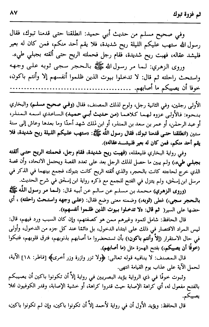وروى الزهري: لما مر رسول الله صلى الله عليه وسلم بالحجر سجى ثوبه على وجهه واستحث راحلته ثم قال: "لا تدخلوا بيوت الذين ظلموا إلا وأنتم باكون؛ خوفا أن يصيبكم ما أصابهم".