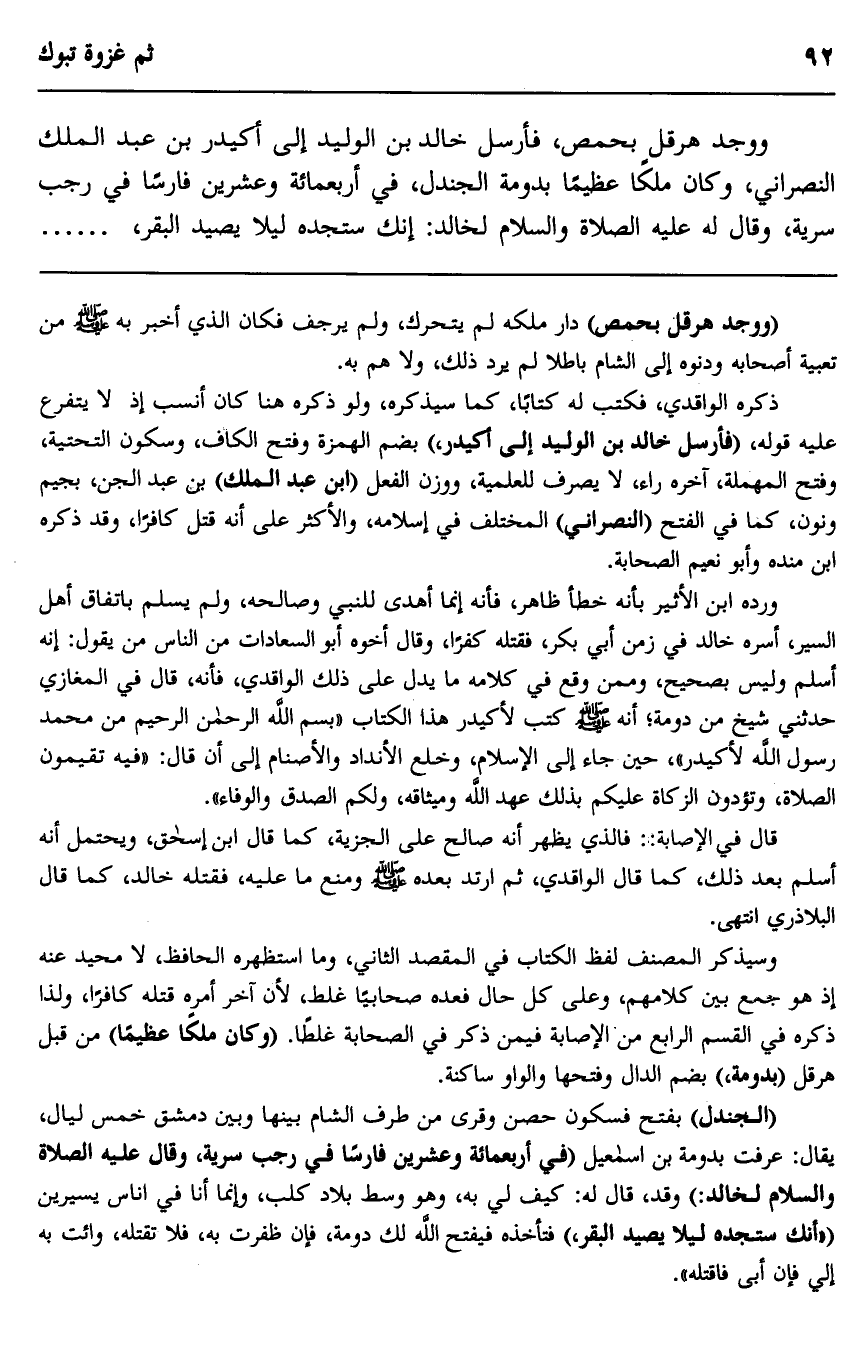 ووجد هرقل بحمص، فأرسل خالد بن الوليد إلى أكيدر بن عبد الملك النصراني، وكان ملكا عظيما بدومة الجندل، في أربعمائة وعشرين فارسا في رجب سرية، وقال له عليه الصلاة والسلام لخالد: "إنك ستجده ليلا يصيد البقر"،