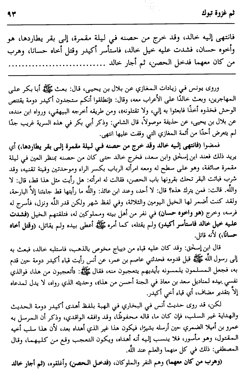 فمضوا "فانتهى إليه خالد وقد خرج من حصنه في ليلة مقمرة إلى بقر يطاردها" أي يريد ذلك فعند ابن إسحاق وابن سعد، فخرج خالد حتى كان من حصنه بمنظر العين في ليلة مقمرة صائفة، وهو على سطح له ومعه امرأته الرباب بكسر الراء وموحدتين وقينة تقنيه، وقد شرب فباتت البقر تحك بقرونها باب الحصن، فقالت له امرأته: هل رأيت مثل هذا قط، قال: لا والله. قالت: فمن يترك هذه؟ قال: لا أحد، وعند ابن عائذ: والله ما رأيتها قط جاءتنا إلا البارحة، ولقد كنت أضمر لها الخيل اليومين والثلاثة، وفي لفظ شهر ولكن قدر الله ونزل، فأسرج له فرسه، وخرج "هو وأخوه حسان" في نفر من أهل بيته ومملوكين له، فتلقتهم الخيل "فشدت عليه خيل خالد فاستأسر أكيدر" ولم يقتله، كما أمره صلى الله عليه وسلم أعطى بيده ولم يقاتل، "وقتل أخاه حسانا" لأنه قاتل.