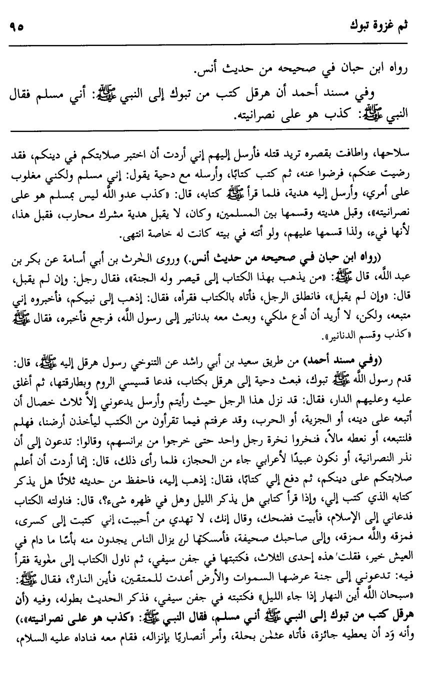 وفي مسند أحمد أن هرقل كتب من تبوك إلى النبي صلى الله عليه وسلم أني مسلم فقال النبي صلى الله عليه وسلم: "كذب هو على نصرانيته".