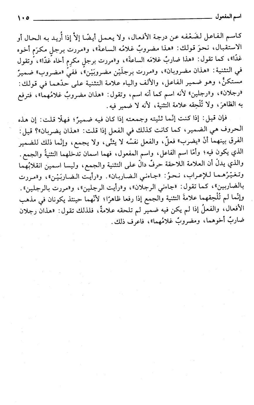 فإن قيل: إذا كنت إنّما ثنّيته وجمعته إذا كان فيه ضميرٌ؛ فهلّا قلت: إن هذه الحروف هي الضمير، كما كانت كذلك في الفعل إذا قلت: "هذان يضربان"؟ قيل: الفرق بينهما أنّ "يضرب" فعلٌ، والفعل نفسُه لا يثنَّى، ولا يجمع، وإنّما ذلك للضمير الذي يكون فيه؛ وأما اسم الفاعل، واسم المفعول، فهما اسمان تدخلهما التثنيةُ والجمع. والذي يدلّ أن العلامة اللاحقة حرفٌ قال على التثنية والجمع، وليسا اسمين انقلابُهما وتغيرُهما للإعراب، نحوُ: "جاءني الضاربان". و"رأيت الضاربَيْن"، و"مررت بالضاربين"، كما تقول: "جاءني الرجلان"، و"رأيت الرجلين"، و"مررت بالرجلين". وإنّما لم تُلْحِقهما علامةَ التثنية والجمع إذا رفعا ظاهرًا؛ لأنهما حينئذ يكونان في مذهب الأفعال، والفعلُ إذا لم يكن فيه ضمير لم تلحقه علامة، فلذلك تقول: "هذان رجلان ضاربٌ أخوهما، ومضروبٌ غلامُهما"، فاعرف ذلك.