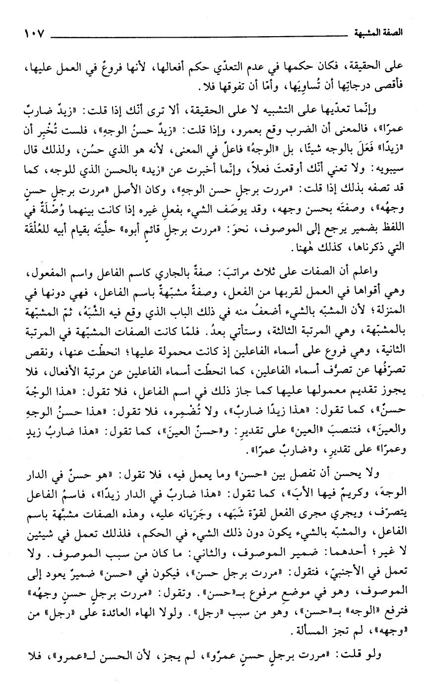 وإنّما تعدّيها على التشبيه لا على الحقيقة، ألا ترى أنّك إذا قلت: "زيدٌ ضاربٌ عمرًا"، فالمعنى أن الضرب وقع بعمرو، وإذا قلت: "زيدٌ حسنُ الوجهِ"، فلست تُخْبِر أن "زيدًا" فَعَلَ بالوجه شيئًا، بل "الوجهُ" فاعلٌ في المعنى, لأنّه هو الذي حسُن، ولذلك قال سيبويه: ولا تعني أنّك أوقعتَ فعلًا، وإنّما أخبرت عن "زيد" بالحسن الذي للوجه، كما قد تصفه بذلك إذا قلت: "مررت برجل حسن الوجهِ"، وكان الأصل "مررت برجلٍ حسنٍ وجهُه"، وصفتَه بحسن وجهه، وقد يوصَف الشيء بفعلِ غيره إذا كانت بينهما وُصْلَة في اللفظ بضمير يرجع إلى الموصوف، نحوَ: "مررت برجلٍ قائمٍ أبوه" حلَّيتَه بقيام أبيه للعُلْقَة التي ذكرناها، كذلك ها هنا.