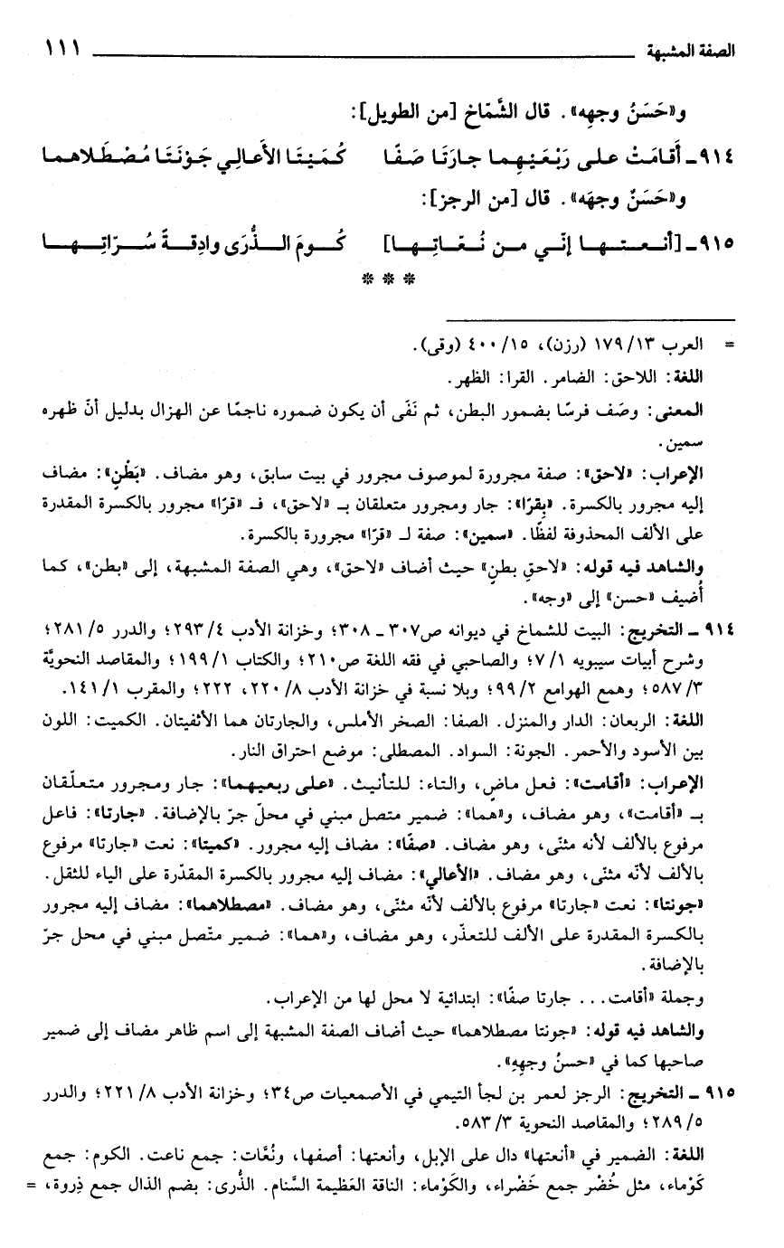 والشاهد فيه قوله: "لاحقِ بطنٍ" حيث أضاف "لاحق"، وهي الصفة المشبهة، إلى "بطن"، كما أُضيف "حسن" إلى "وجه".