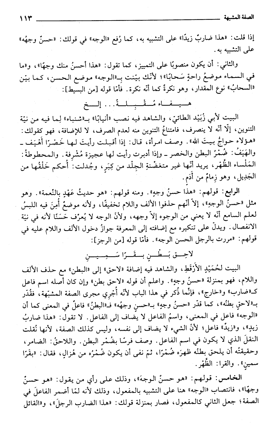 الخامس: قولهم: "هو حسنٌ الوجهَ"، وذلك على رأي من يقول: "هو حسنٌ وجهًا"، فانتصاب "الوجه" هنا على التشبيه بالمفعول، وذلك لأنّه لما أضمر الفاعلَ في الصفة؛ جعل الثاني كالمفعول، فصار بمنزلة قولك: "هذا الضارب الرجلَ"، و"القائل