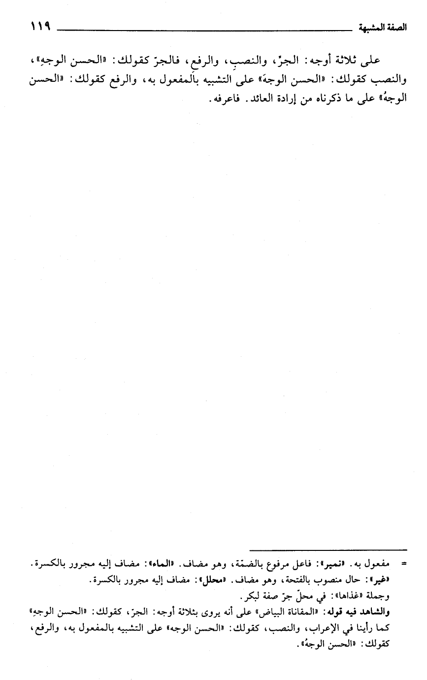على ثلاثة أوجه: الجرّ، والنصب، والرفع، فالجرّ كقولك: "الحسن الوجهِ"، والنصب كقولك: "الحسن الوجهَ " على التشبيه باَلمفعول به، والرفع كقولك: "الحسن الوجهُ" على ما ذكرناه من إرادة العائد. فاعرفه.