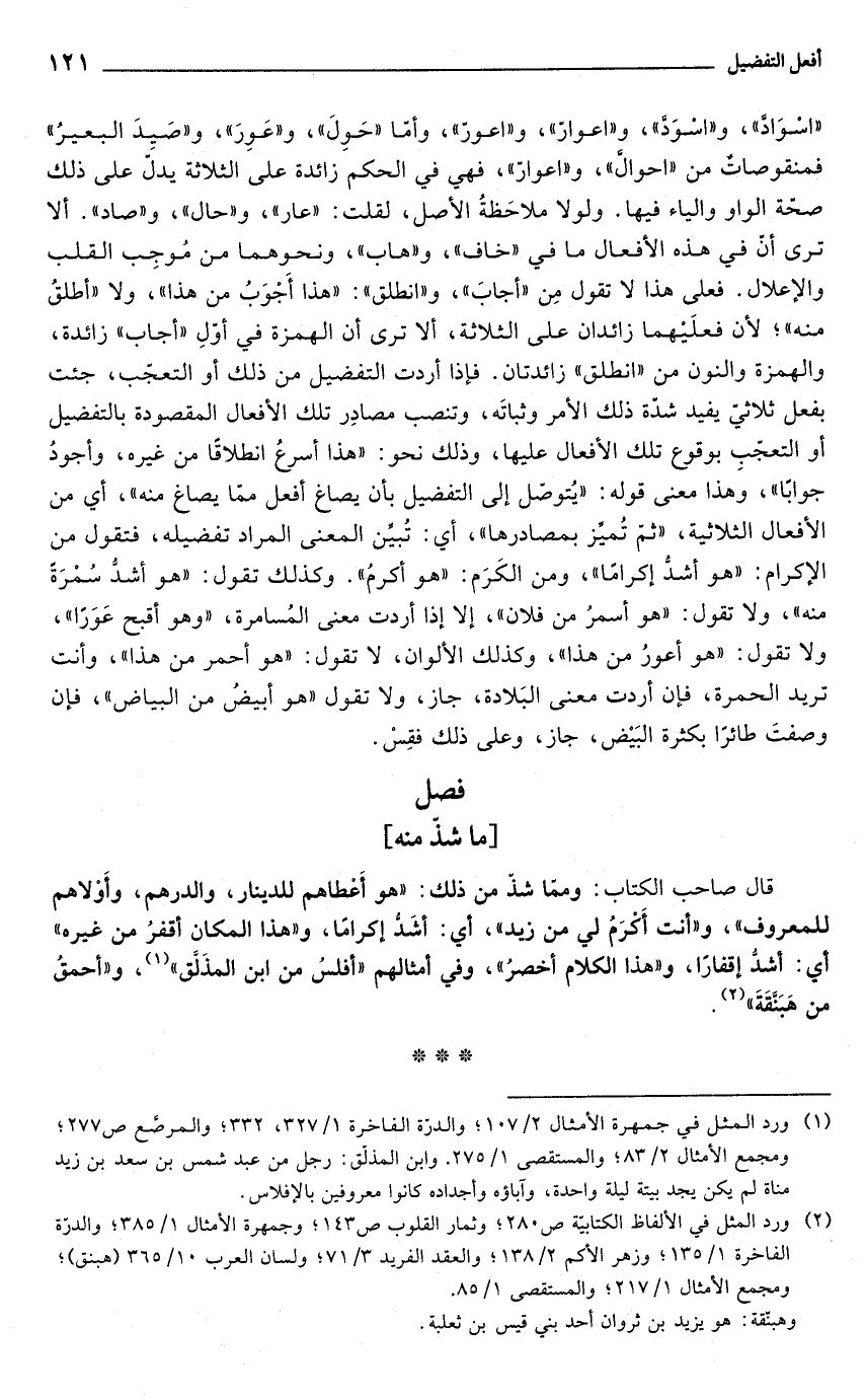 "اسْوَادَّ"، و"اسْوَدَّ"، و"اعوارّ"، و"اعورّ"، وأما "حَوِلَ"، و"عَوِرَ"، و"صَيِدَ البعيرُ" فمنقوصاتٌ من "احوالَّ"، و"اعوارّ"، فهي في الحكم زائدة على الثلاثة يدلّ على ذلك صحة الواو والياء فيها. ولولا ملاحَظةُ الأصل، لقلت: "عار"، و"حال"، و"صاد". ألا ترى أن في هذه الأفعال ما في "خاف"، و"هاب"، ونحوهما من مُوجِب القلب والإعلال. فعلى هذا لا تقول مِن "أجابَ"، و"انطلق": "هذا أَجْوَبُ من هذا"، ولا "أطلقُ منه"؛ لأن فعلَيْهما زائدان على الثلاثة، ألا ترى أن الهمزة في أوّلِ "أجاب" زائدة، والهمزة والنون من "انطلق" زائدتان. فإذا أردت التفضيل من ذلك أو التعجّب، جئت بفعل ثلاثي يفيد شدّة ذلك الأمر وثباتَه، وتنصب مصادِر تلك الأفعال المقصودة بالتفضيل أو التعجّبِ بوقوع تلك الأفعال عليها، وذلك نحو: "هذا أسرعُ انطلاقًا من غيره، وأجودُ جوابًا"، وهذا معنى قوله: "يُتوصّل إلى التفضيل بأن يصاغ أفعل ممّا يصاغ منه"، أي من الأفعال الثلاثية، "ثمّ تُميِّز بمصادرها"، أي: تُبيِّن المعنى المراد تفضيله، فتقول من الإكرام: "هو أشد إكرامًا"، ومن الكَرَم: "هو أكرمُ ". وكذلك تقول: "هو أشد سُمْرَةَ منه"، ولا تقول: "هو أسمرُ من فلان"، إلا إذا أردت معنى المُسامرة، "وهو أقبح عَوَرًا"، ولا تقول: "هو أعورُ من هذا"، وكذلك الألوان، لا تقول: "هو أحمر من هذا"، وأنت تريد الحمرة، فإن أردت معنى البَلادة، جاز، ولا تقول "هو أبيضُ من البياض"، فإن وصفتَ طائرًا بكثرة البَيْض، جاز، وعلى ذلك فقِسْ.