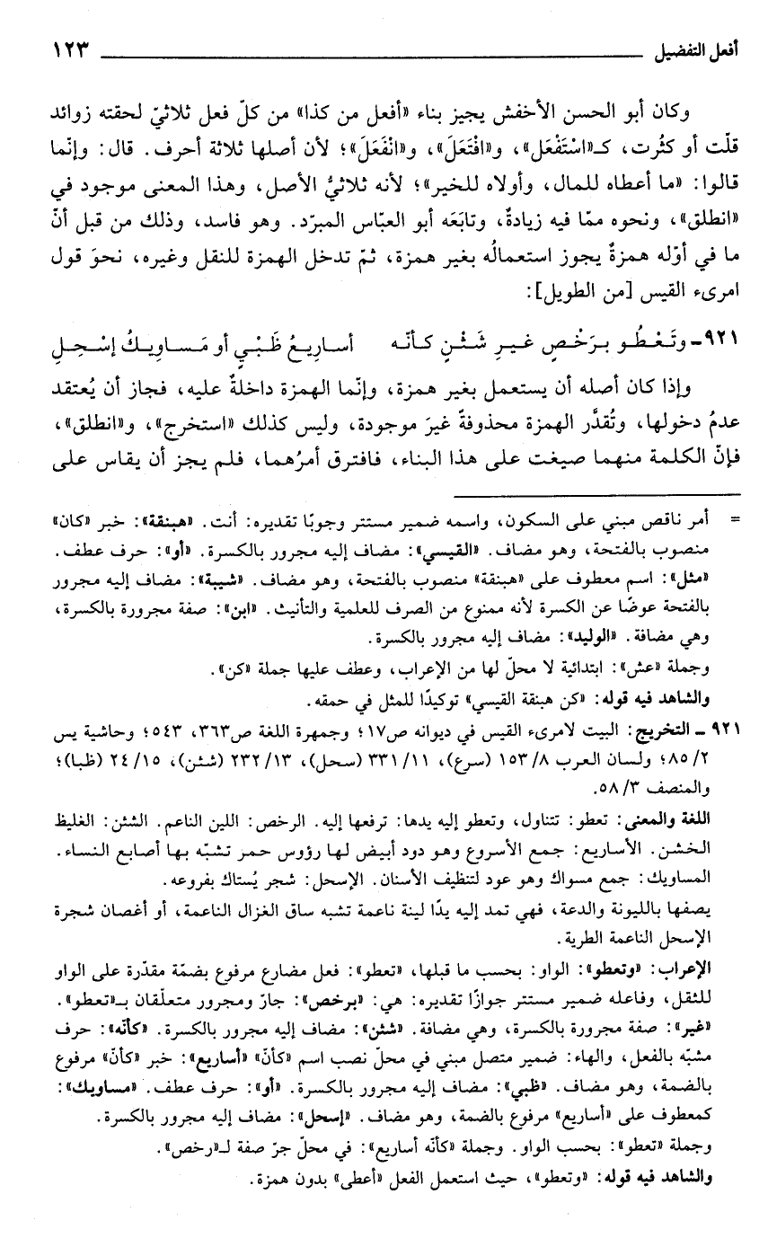 وكان أبو الحسن الأخفش يجيز بناء "أفعل من كذا" من كلّ فعل ثلاثيّ لحقته زوائد قلت أو كثُرت، كـ "اسْتَفْعَل"، و"افْتَعَلَ"، و"انْفَعَلَ"؛ لأن أصلها ثلاثة أحرف. قال: وإنّما قالوا: "ما أعطاه للمال، وأولاه للخير"؛ لأنّه ثلاثي الأصل، وهذا المعنى موجود في "انطلق"، ونحوه ممّا فيه زيادة، وتابَعَه أبو العبّاس المبرّد. وهو فاسد، وذلك من قبل أن ما في أوّله همزة يجوز استعمالُه بغير همزة، ثمّ تدخل الهمزة للنقل وغيره، نحوَ قول امرئ القيس [من الطويل]: