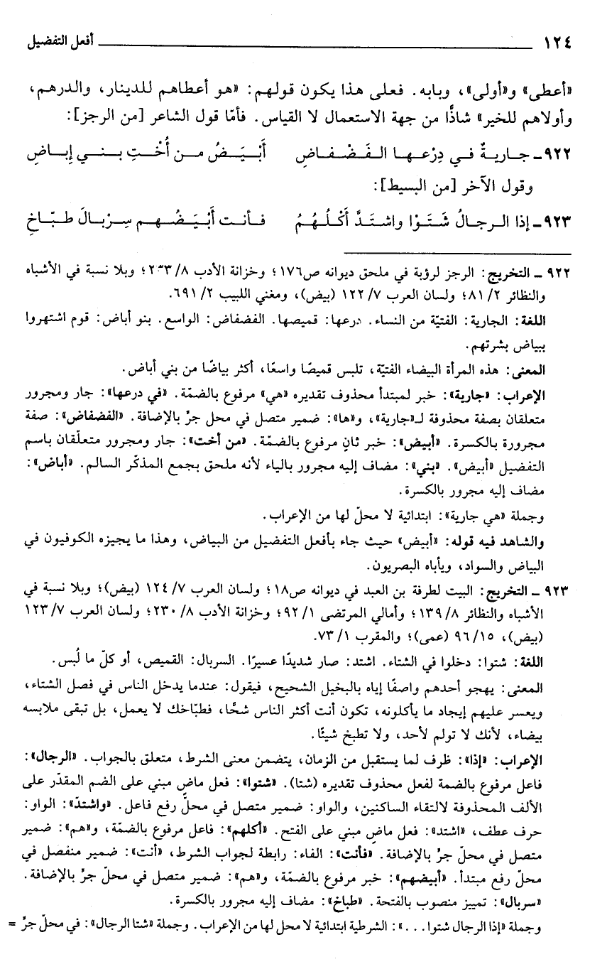 الإعراب. "جارية": خبر لمبتدأ محذوف تقديره "هى" مرفوع بالضمّة. "في درعها": جار ومجرور متعلقان بصفة محذوفة لـ "جارية"، و"ها": ضمير متصل في محل جرّ بالإضافة. "الفضفاض": صفة مجرورة بالكسرة. "أبيص": خبر ثانٍ مرفوع بالضمّة. "من أخت": جار ومجرور متعلّقان باسم التفضيل "أبيض"."بني": مضاف إليه مجرور بالياء لأنّه ملحق بجمع المذكر السالم. "أباض": مضاف إليه مجرور بالكسرة.