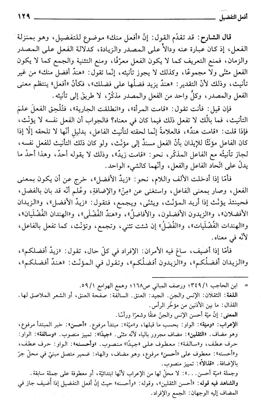 قال الشارح: قد تقدّم القول: إنّ "أفعل منك" موضوع للتفضيل، وهو بمنزلة الفعل، إذ كان عبارة عنه ودالًّا على المصدر والزيادة، كدلالة الفعل على المصدر والزمان، فمنع التعريف كما لا يكون الفعل معرَّفًا، ومنع التثنية والجمع كما لا يكون الفعل مثنّى ولا مجموعًا، وكذلك لا يجوز تأنيثه، إنّما تقول: "هندٌ أفضل منك" من غير تأنيث، وذلك لأن التقدير: "هندٌ يزيد فضلُها على فضلك"، فكأن "أفعل" ينتظم معنى الفعل والمصدر، وكل واحد من الفعل والمصدر مذكّرٌ، لا طريقَ إلى تأنيثه.