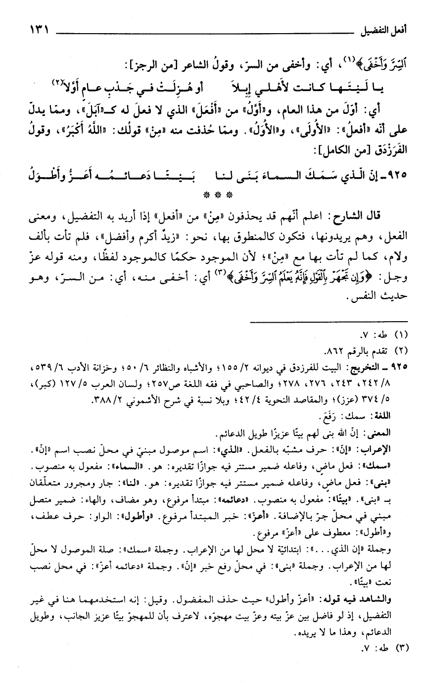 والشاهد فيه قوله: "أعزّ وأطول" حيث حذف المفضول. وقيل: إنه استخدمهما هنا في غير التفضيل، إذ لو فاضل بين عزّ بيته وعزّ بيت مهجوّه، لاعترف بأنّ للمهجوّ بيتًا عزيز الجانب، وطويل الدعائم، وهذا ما لا يريده.