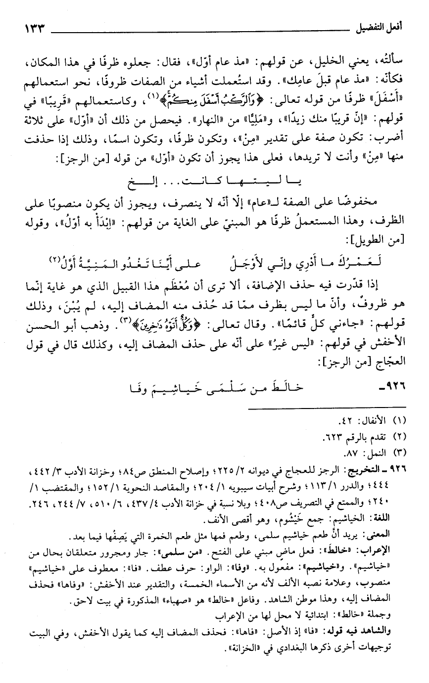 سألتُه، يعني الخليل، عن قولهم: "مذ عام أوّل"، فقال: جعلوه ظرفًا في هذا المكان، فكأنه: "مذ عام قبلَ عامِك". وقد استُعملت أشياء من الصفات ظروفًا، نحو استعمالهم "أَسْفَلَ" ظرفًا من قوله تعالى: {وَالرَّكْبُ أَسْفَلَ مِنْكُمْ} (¬1)، وكاستعمالهم "قَرِيبًا" في قولهم: "إن قريبًا منك زيدًا"، و"مَلِيًّا" من "النهار". فيحصل من ذلك أن "أوّل" على ثلاثة أضرب: تكون صفة على تقدير "مِنْ"، وتكون ظرفًا، وتكون اسمًا، وذلك إذا حذفت منها "مِنْ" وأنت لا تريدها، فعلى هذا يجوز أن تكون "أوّل" من قوله [من الرجز]: